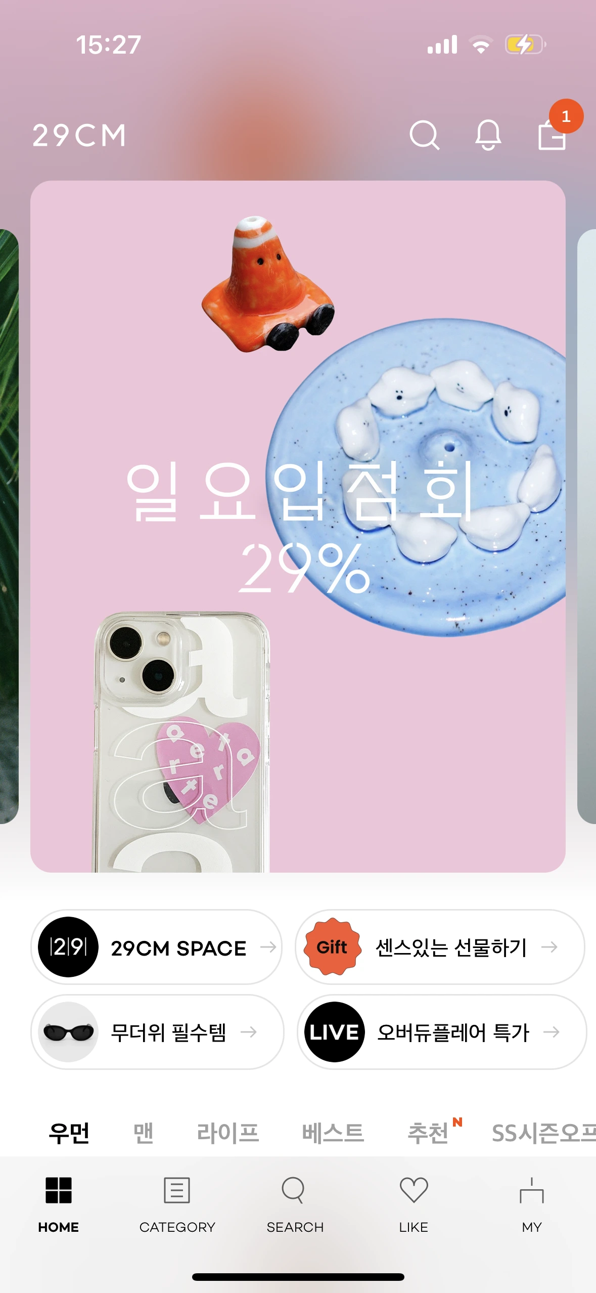 29cm의 메인 화면에서 가장 큰 비율을 차지하는 배너가 눈에 띈다. 깔끔한 UX 라이팅과 함께 감각적인 이미지가 돋보인다. 큰 사진 이미지와 라이팅을 통해 스토리텔링을 통해 상품의 매력을 돋보이게 하는 29cm의 차별성이 드러난다.