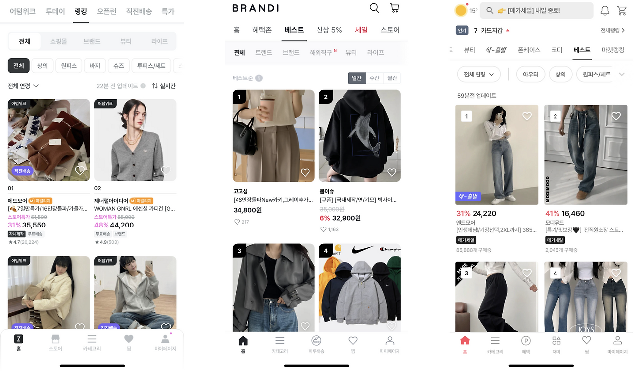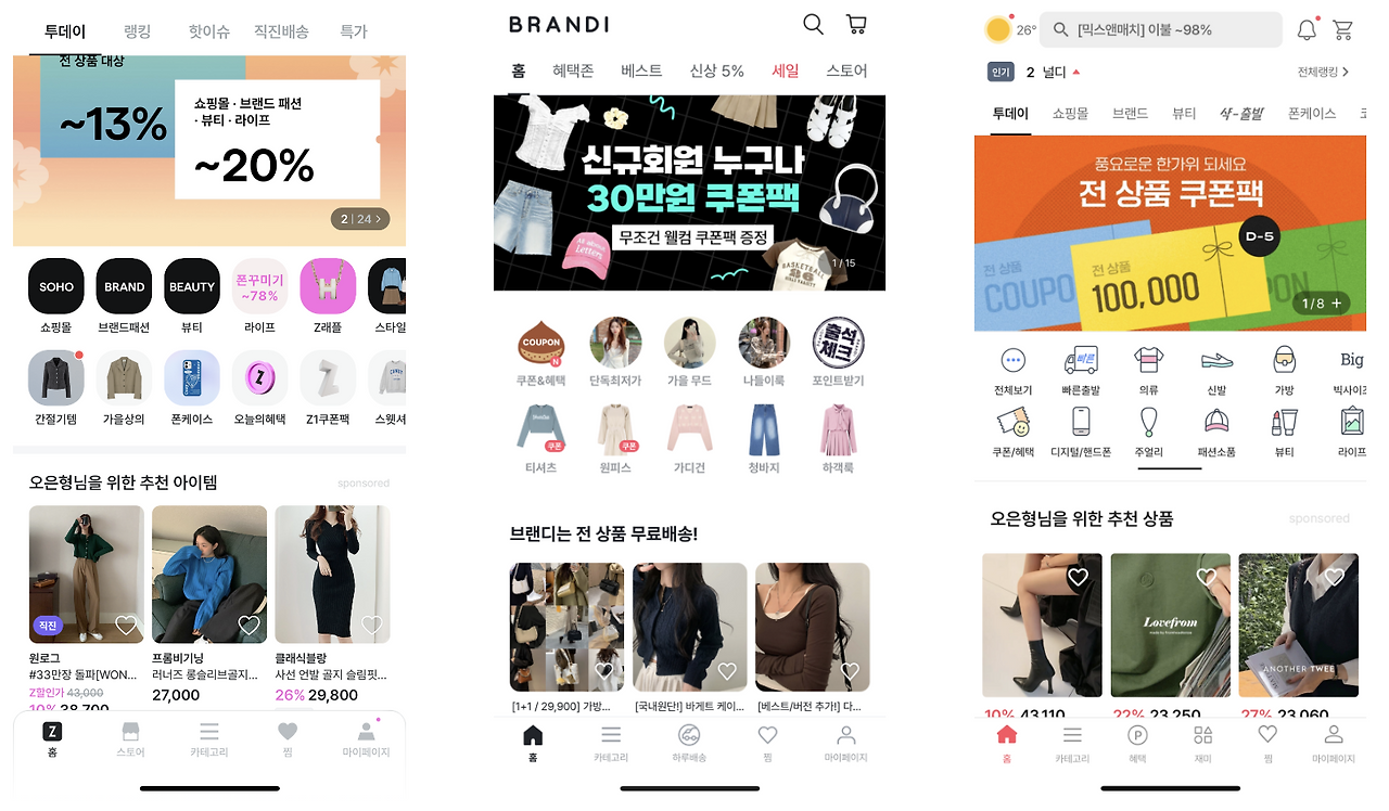 새로운 방향성이 필요한 이유는 직접경쟁사 간 메인 화면 비교로 알 수 있었다. 세 곳 모두 쿠폰과 같은 할인을 강조하고, 추천 상품을 통한 상품 탐색 기능으로 화면을 구성하고 있다. 경쟁사 간 차별성이 존재하지 않고 할인으로 경쟁한다면, 가격대가 저렴한 곳을 사용할 수밖에 없다.