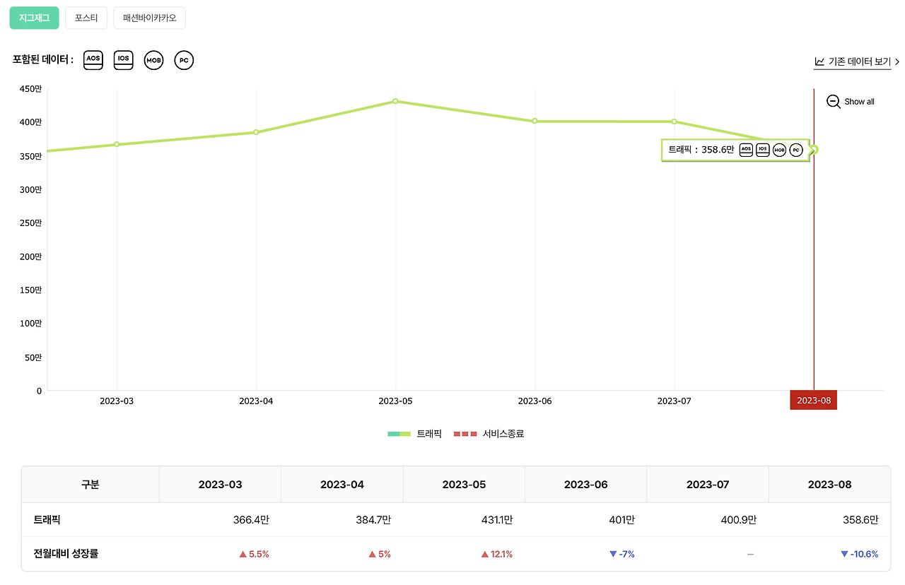 사실 지그재그를 사용하는 사람들이 유지될 것이라 추측하였다. 오래된 서비스이기도 하고, 여성 패션 커머스 중에서 가장 유명하기에 고객 의존도가 높을 것이라 생각하였다. 생각한 대로 최대 433.1만 MAU를 기록하는 등 많은 활성 사용자를 보유하고 있지만, 6월을 기점으로 MAU가 지속적인 하향세를 그리고 있었다.