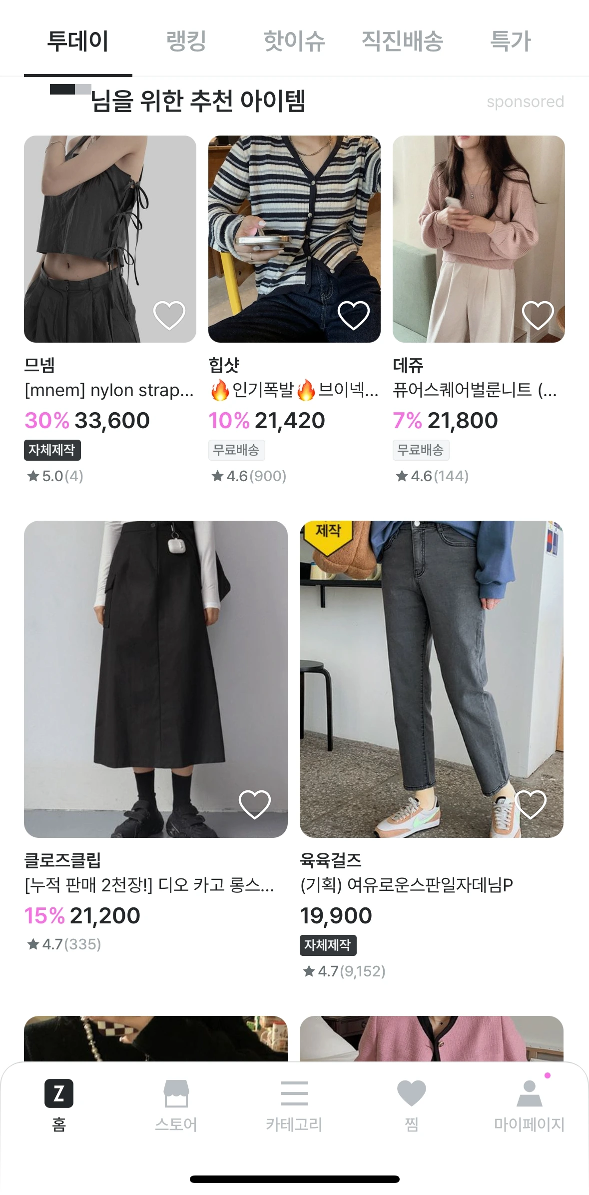 현재 지그재그는 추천 기준 설명이 부재하여 어떤 방식으로 추천을 진행하는지 명확하지는 않다. 구매 이력 및 저장한 스토어 등 데이터를 이용한 것으로 추측되지만, '유사상품추천'이나 '비슷한 스토어 추천' 등 다른 긍정적인 피드백을 받는 기능보다는 탐색 과정에 도움을 주는 방향성에서 아쉬움이 남았다.