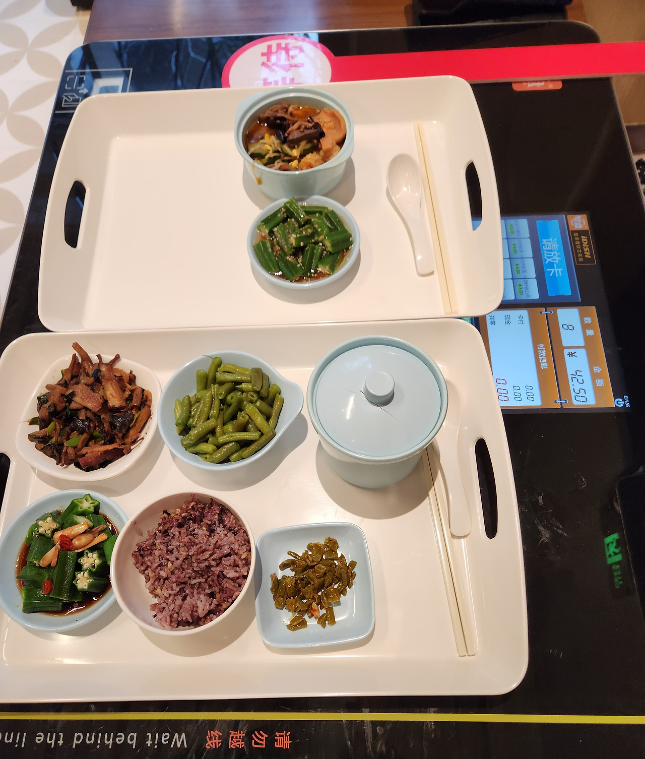 트레이를 통째로 올려놓으면 가격이 표시되고 핸드폰의 QR코드를 스캔하면 된다.