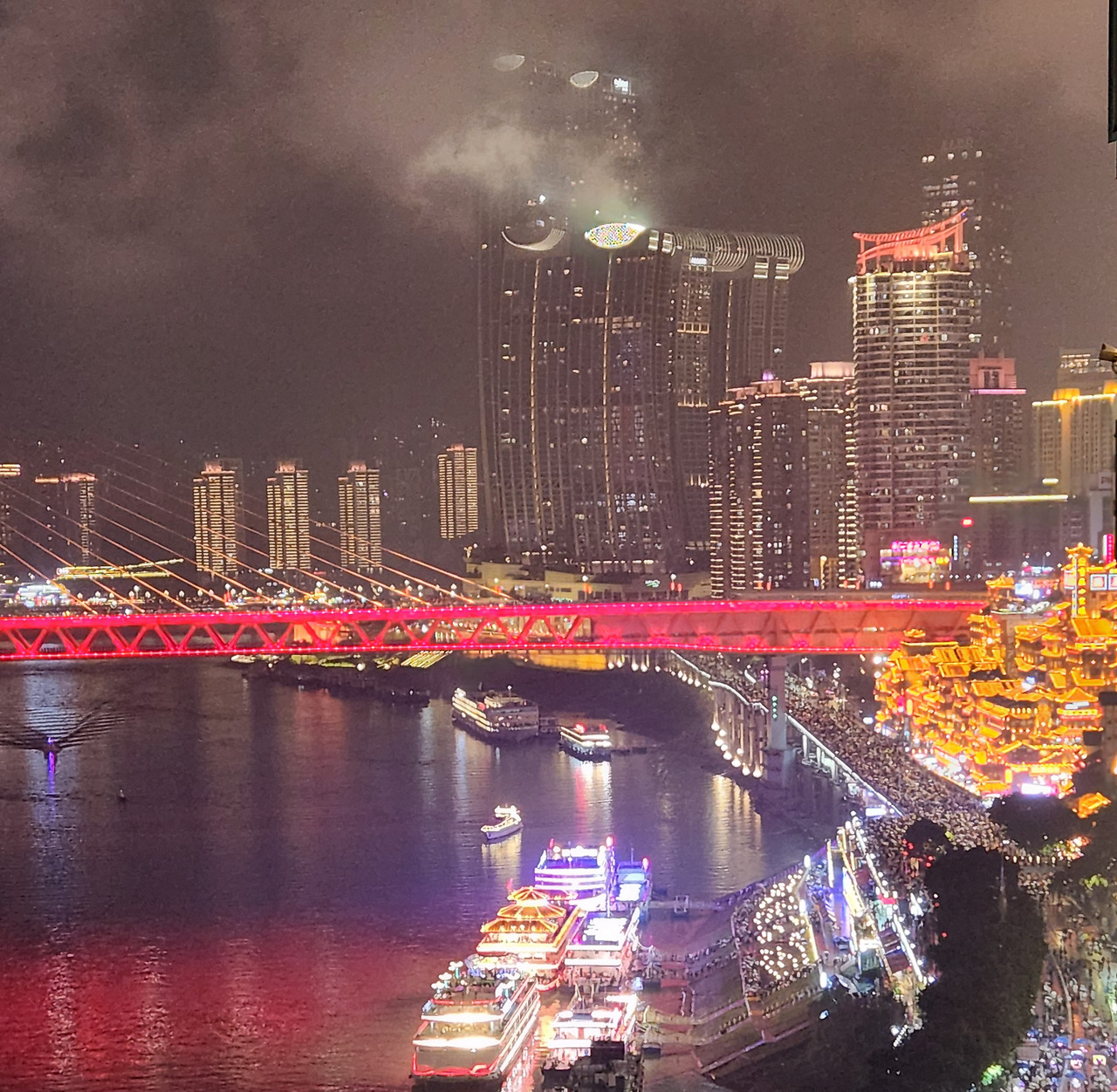 황금 불빛의 홍야동(洪崖洞) 앞길은 관광객들이 몰려 강아지 한마리 지나가기 힘들다.