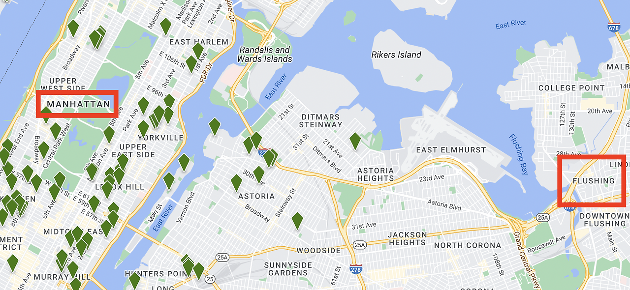 Flushing은 퀸즈에 위치해 있고, 아시안의 비중이 더 많은 도시입니다.