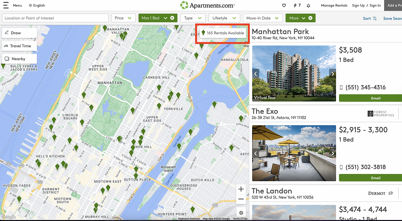 자신만의 기준이 확고하다면, 매물을 narrow down 해서 빨리 둘러볼 수 있어요. 임의적으로 Studio, One Bed, 그리고 in unit laundry를 필터링하면 165곳 정도 나오네요.
