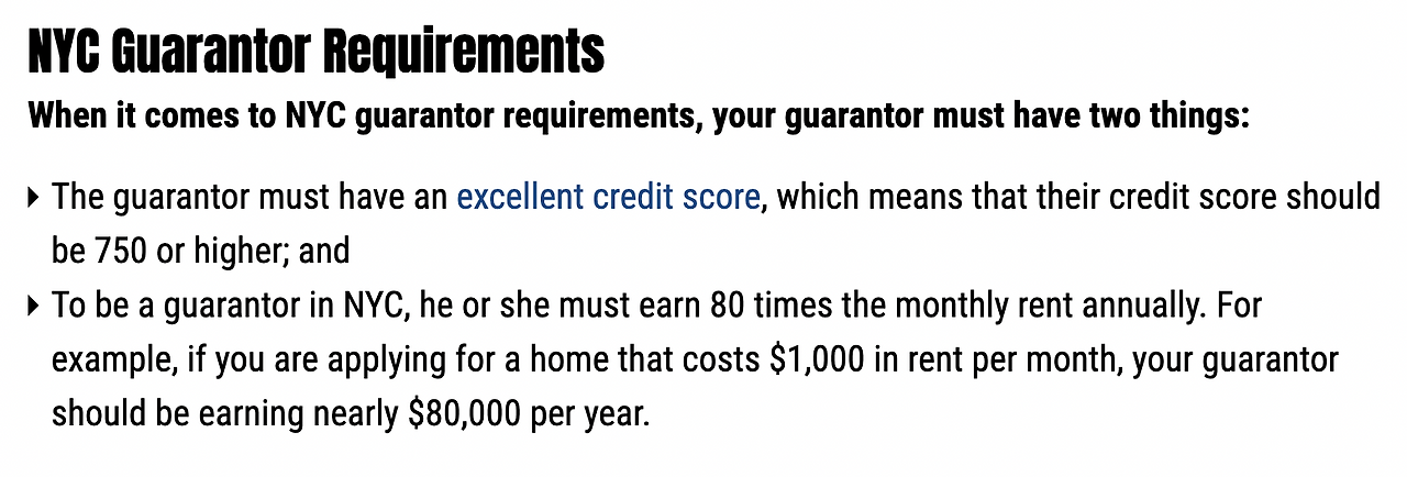 Guarantor 경우, 뉴욕에 위치한 사람/기관인 것이 통과될 확률이 높고, 렌트의 80배의 수입이 있어야 합니다. 증명해야 하는 서류들도 많기에 Guarantor를 미리 확보하거나 알아보시는 것을 추천합니다.