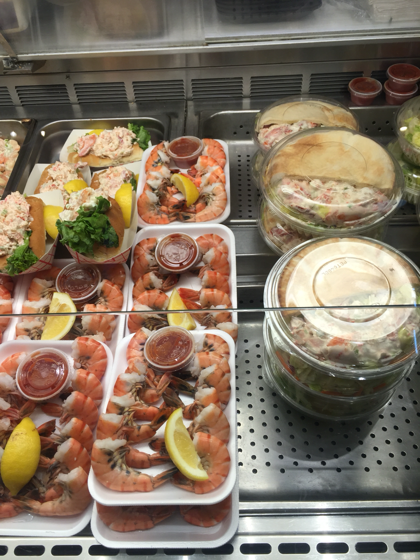 한 가게에 진열되어 있는 새우와 lobster roll.