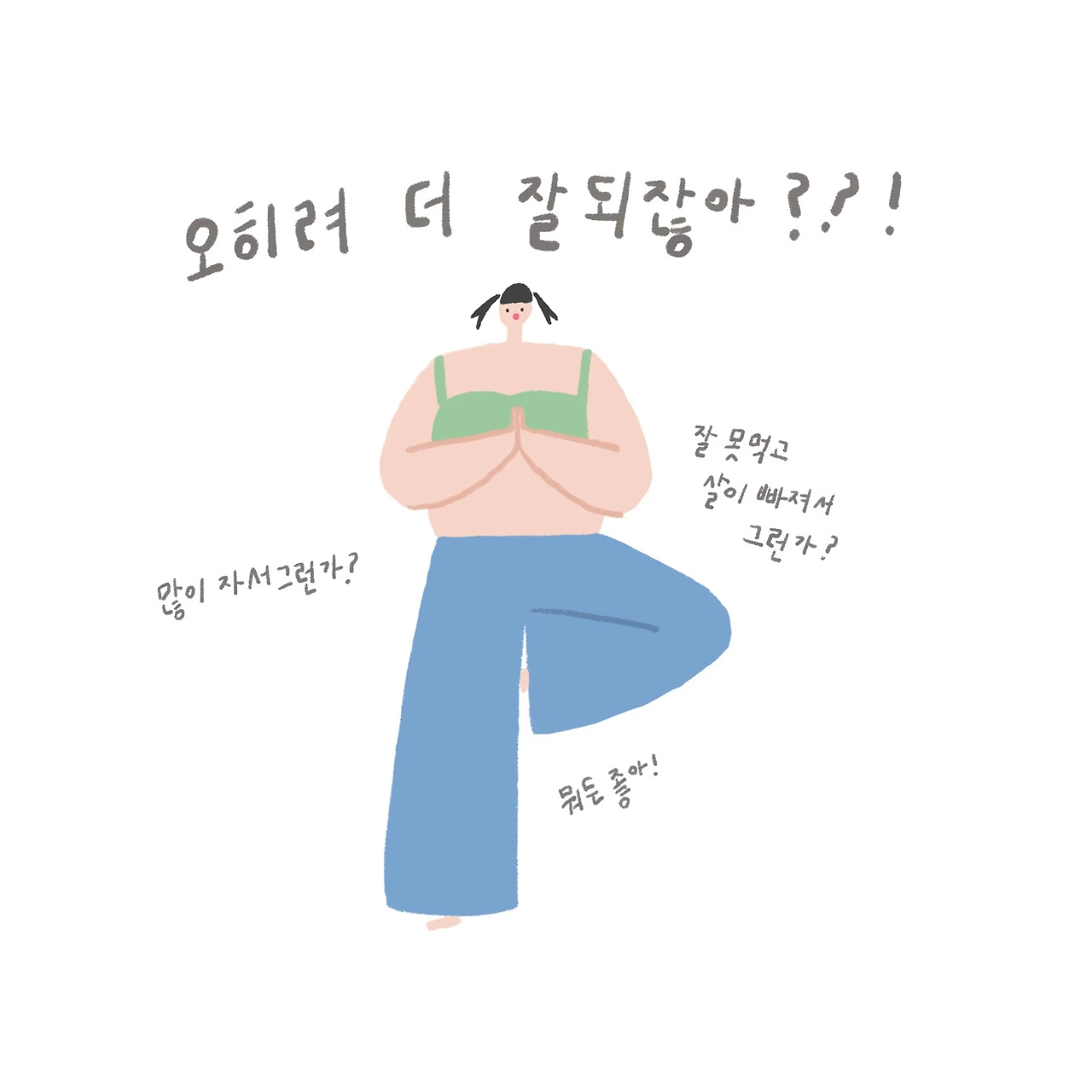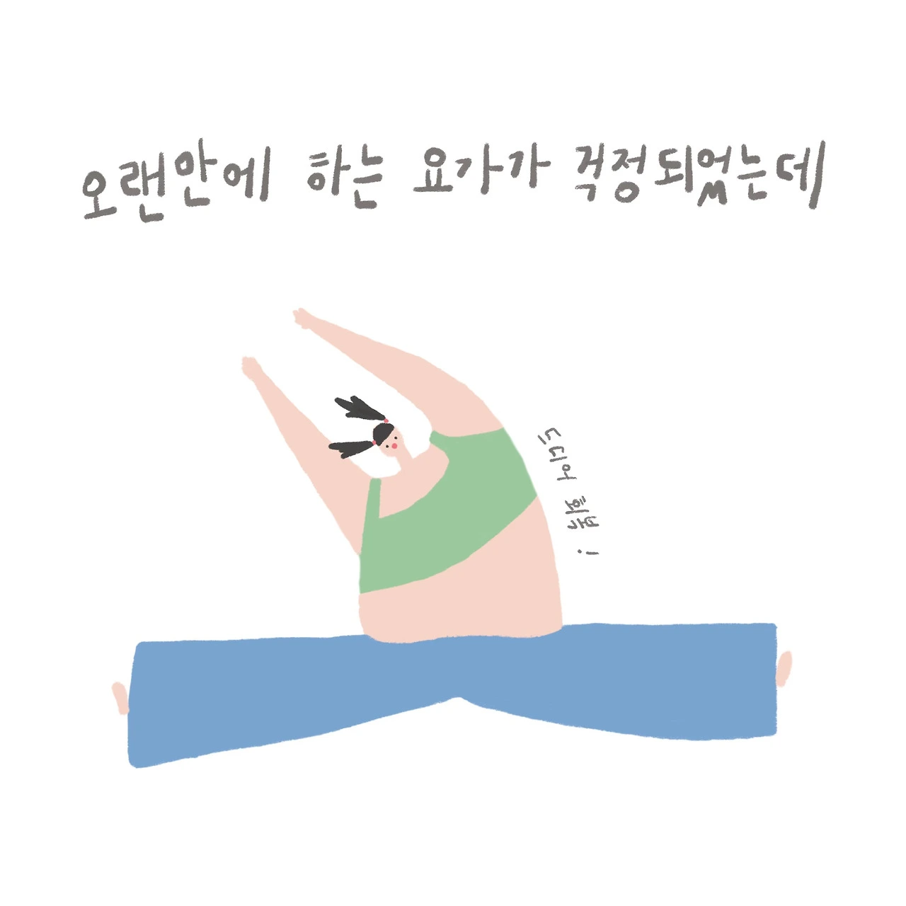 걱정이 무색할 만큼 3주 전보다 훨씬 더 유연하고 가볍게 동작을 이어갔다. 하면서도 유독 더 잘 되고 자연스럽다는 것이 스스로 느껴졌다. 그건 선생님 눈에도 마찬가지였다. 일이 많은 날에는 잠을 줄여가며 매일 수련을 이어갔는데, 그때보다 지금 컨디션이 더 좋다니. 쉬어가면 금방 뻗뻗해질 줄 알았다. 매일 하지 않으면 까먹을 줄 알았다. 아픈 시간은 힘들었지만, '몸'에 대한 새로운 깨달음이었다.