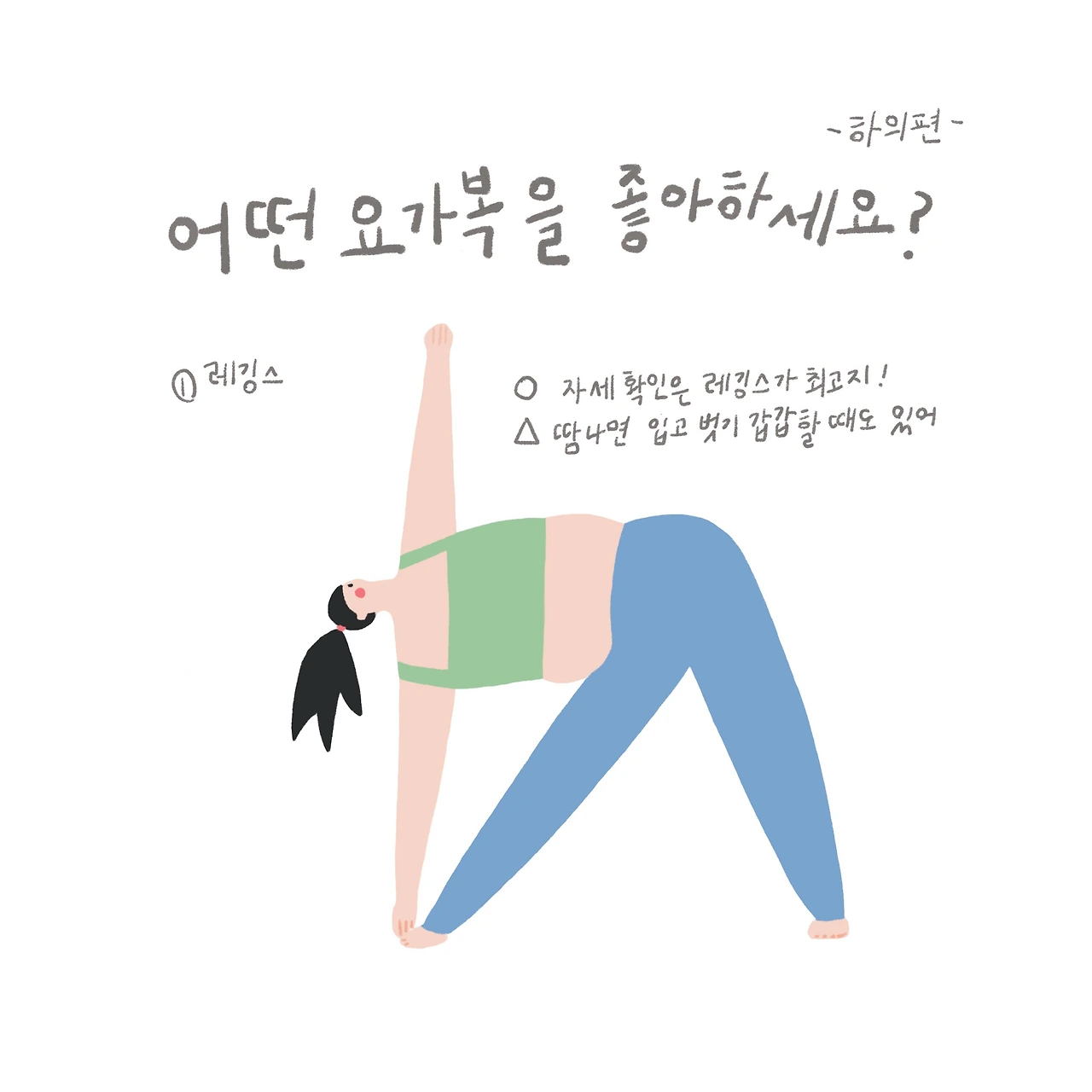요가에 편한 재질에 대해 알지 못했고, 브라탑만 입고 하는 운동이 익숙하지 않았다. 하렘바지와 짧은 레깅스는 입어본 적이 없었고, 긴 레깅스마저도 오랜만에 새로 구입하려 하니 인터넷 상세 페이지로만 소재와 사이즈를 정하기는 어려웠다. 거기다 요즘 멋지고 예쁜 요가복 브랜드는 언제 그렇게 많이 생긴 건지, 그들의 멋진 철학에 반했다가, 또 다른 예쁜 화보에 눈길이 가기를 반복했다.