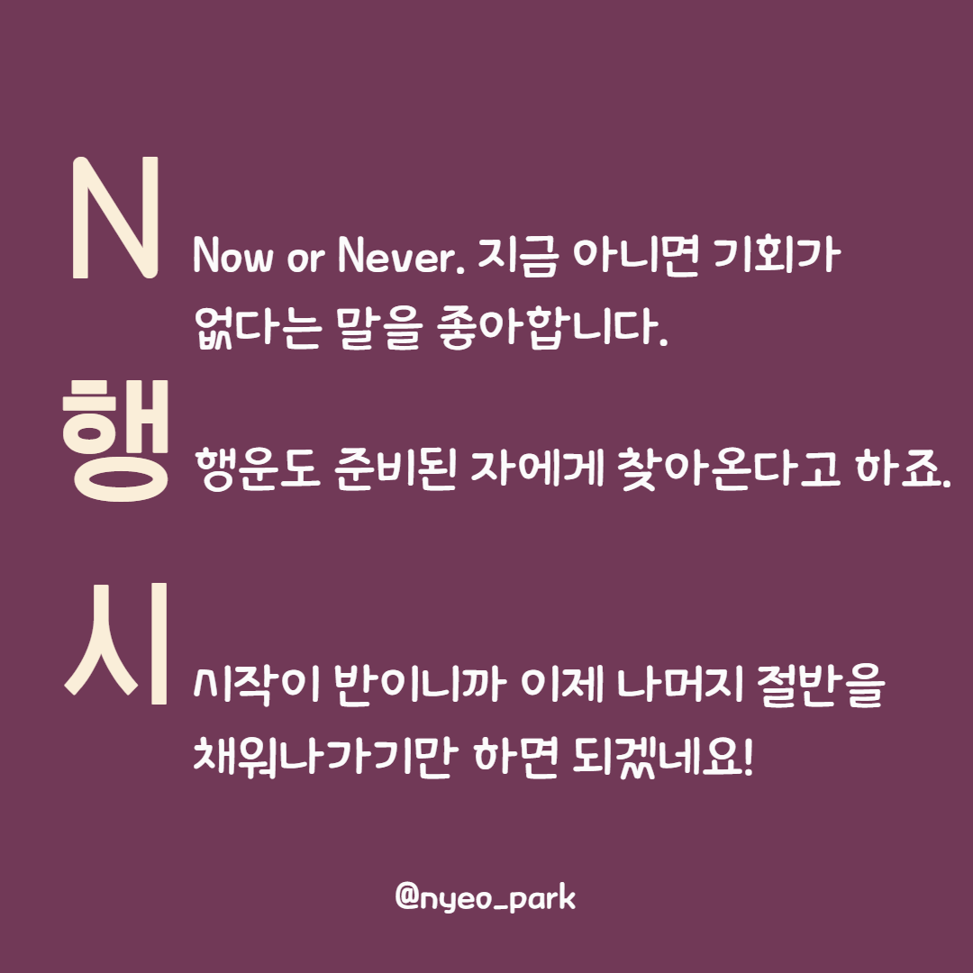 매력도 분명하다. 비록 손을 움직이는 시간보다 머리 굴리는 시간이 훨씬 길지만 기존 브런치 글을 발행할 때보다 시간, 장소 제약 없이 여유롭게 글을 쓸 수 있고, 주제어가 무궁무진한 덕분에 소재 걱정도 필요 없다. 거기에 단어를 고민하고 찾아보면서 어휘력이 상승하는 효과까지. 특히 브런치를 하면서 SNS를 제대로 활용하지 못하는 점이 아쉬웠는데 짧은 글의 장점을 살려 두 마리 토끼를 모두 잡아보려 한다. 내게 N행시는 이런저런 핑계로 브런치가 부담스러워졌을 때 나타난 가뭄의 단비 같은 존재다. 시작이 반이니 나머지 절반을 채우기 위해 앞으로 종종 찾아오겠다.