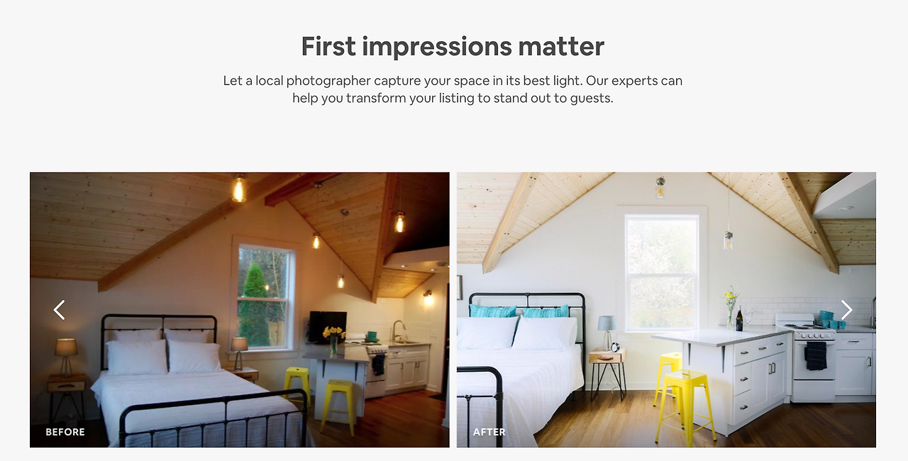 그들의 사진 촬영 서비스는 어떻게 에어비앤비를 키우는 데 일조했을까? 그것은 이 서비스가 좋은 스토리 텔링을 했기 때문이었다. 즉, '극적으로' 사용자가 갖고 있던 문제를 해결해주었던 것이다. 사용자는 에어비앤비의 리스팅에 대해 호텔 대비 퀄리티가 괜찮을지에 대한 의심을 가질 수 있는데, 멋진 사진으로 이것을 해결해주었던 것이다. 만약, 그들이 사진이 아니라 좋은 소개 글로 승부를 했다면, 환불정책만으로 승부했다면 에어비앤비에 대한 신뢰도가 지금처럼 올라갔을까? 확실한 건 그들이 사진으로 승부를 했을 때에 시장에서 폭발적인 반응이 왔다는 것이다.