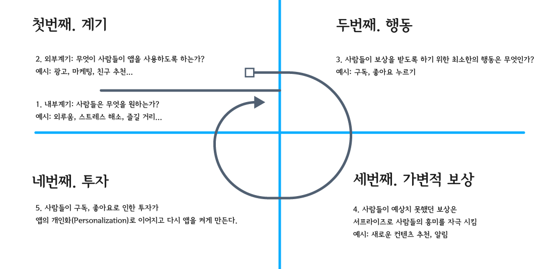 계기에는 외부계기와 내부계기가 있습니다. 먼저 내부계기로 사람들은 외로움을 달래거나, 즐거움을 추구하고, 슬픔에 위로를 받기 위해 무언가를 갈구합니다. 이 때 등장하는 것이 외부계기입니다. 앱은 귀신같이 사람들의 그런 시점을 찾아 광고, 검색, 마케팅 등을 통해 사람들이 앱을 시작하도록 만듭니다. 앱을 만드는 사람들은 앱을 성공시키기 위해서 이 두 가지를 모두 고려해야 합니다.