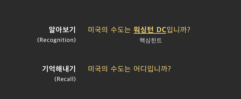 첫번째 질문은 워싱턴 DC라는 핵심힌트를 제공하고 있기 때문에 미국의 수도가 어디인지 기억을 끄집어내는 과정을 많이 생략할 수 있는 것이지요. 이것이 '알아보기'입니다.