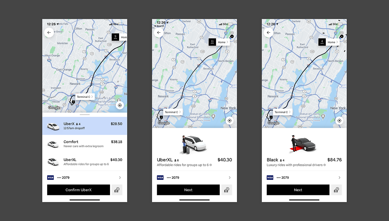 이 경우는 사용자가 알아내기도 할 필요가 없게, 아예 사용자가 '기억을 끄집어내는' 행위 자체를 할 필요가 없도록 설계한 경우입니다. 앞서서 사용자 설명서나 튜토리얼은 UX디자인을 하는데 있어서 사용자에게 기억의 부담을 많이 줄 수 있기 때문에 피하는 것이 좋다고 이야기했는데요. 이보다는 적재적소에 사용자에게 도움이 되는 설명을 하는 것은 꽤 효과적일 수 있습니다. 아래는 우버 예시인데요. 저는 우버를 처음 사용했을 때 UberX가 뭔지, UberXL은 뭔지, Uber Black은 무엇인지 도통 알 수가 없었습니다. 우버에서는 각각의 옵션이 어떤 것을 의미하는지 해당 옵션을 선택하면 나오도록 하고 있습니다. 처음 튜토리얼에 모든 옵션에 대한 설명을 제공하기 보다 그때 그때 옵션을 사용할 때마다 사용자에게 이것은 무엇이다 하고 이야기하면 그것을 쉽게 알아보고 사용할 수 있습니다.