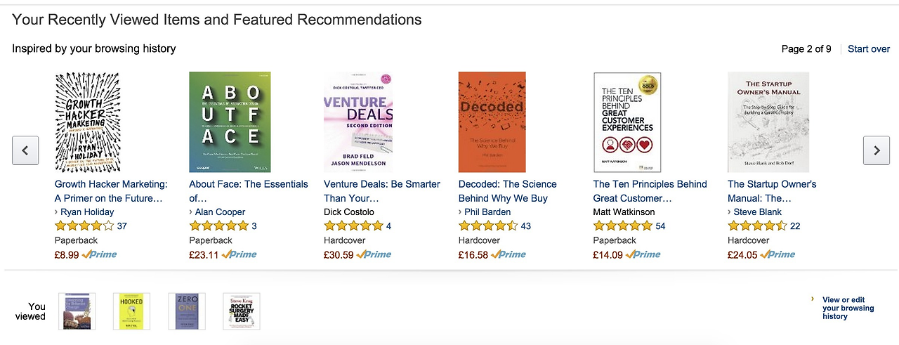 아래는 아마존의 Recently Viewed items의 예시인데요. 사용자가 한번 방문한 적이 있는 제품을 보여주어 다시 한번 검색할 필요 없이 바로 접근할 수 있도록 해주고 있습니다.