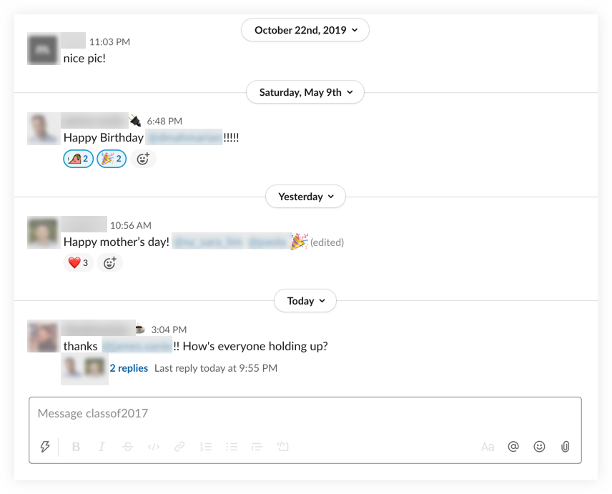 요즘 메신저들은 기본적으로 이전 히스토리를 모두 제공해주고 있습니다. 스마트폰 이전 시대에 메시지 기반의 인터페이스에서는 잘 활용되지 않았던 방식인데요. 지금은 히스토리를 볼 수 있는 기능이 없는 메신저는 좀 많이 불편하게 느껴지는게 사실입니다. 아래는 미국의 업무 전용 메신저 앱인 슬랙의 인터페이스입니다. 과거의 채팅 히스토리를 스크롤만을 통해 확인할 수 있기 때문에 사용자 입장에서는 기억의 부담감이 확 줄게 됩니다.