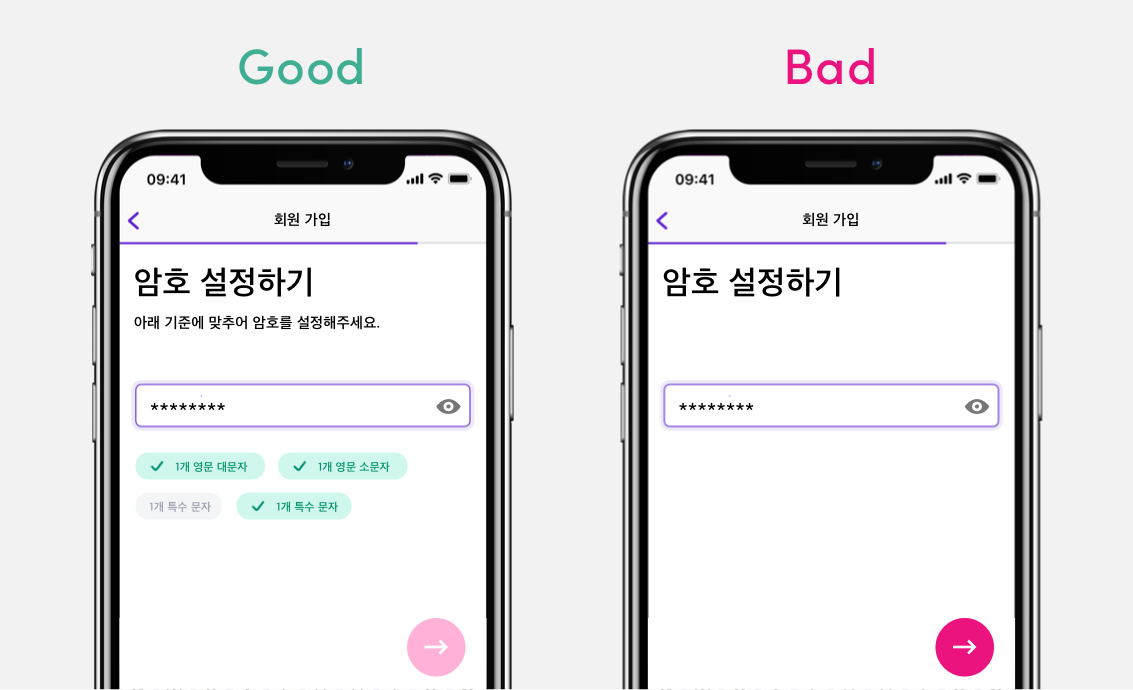 가장 대표적인 예시는 암호 입력창입니다. 아래 예시 화면에서는 암호를 생성하기 위해 입력을 할 때에 어떤 요구조건이 있는지 보여지고, 또 각 조건을 만족시킬 때마다 초록색 체크마크로 명확하게 이를 알려주고 있습니다. 거기에 추가적으로 '다음' 버튼이 요구 조건을 만족시키기 전까지는 비활성화되어 있는 것도 사용자가 실수하는 걸 방지하기 위한 장치로 잘 적용되었습니다.