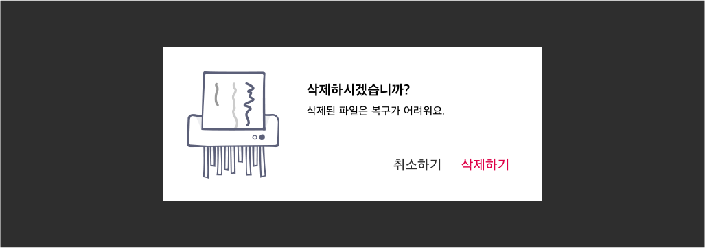 이 외에도 대표적인 것으로 '삭제'에 대한 팝업도 있습니다. 삭제를 한다는 것은 다시 해당 파일이나 문서를 다시 볼 수 없게 되는 것이기에, 이에 대해 다시 한번 물어보는 것이 중요한 것입니다.