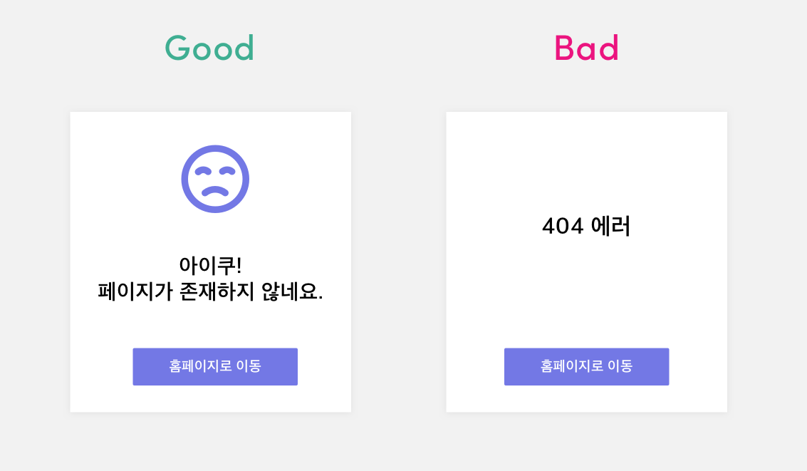 가능하면 사용자의 실수를 방지하도록 디자인을 하는 것이 좋지만, 상황에 따라 이를 피할 수 없는 경우가 있습니다다. 예를 들면 404 에러 페이지가 이런 범주 안에 들어갈 것 같은데요. 이럴 때에는 에러 메시지를 명확하게, 그리고 사용자의 언어로 전달하는 것이 좋습니다. 아래 오른 쪽 예시의 경우, 웹 개발 전문용어인 "404"를 그대로 써놨는데, 이는 사용자 입장에서는 IT계열에서 일하는 사람이 아닌 이상 무슨 뜻인지 모를 가능성이 높습니다다. 그래서 왼쪽과 같이 사람의 언어로 바꿔놓는다면 사용자의 불편함을 덜어줄 수 있습니다.