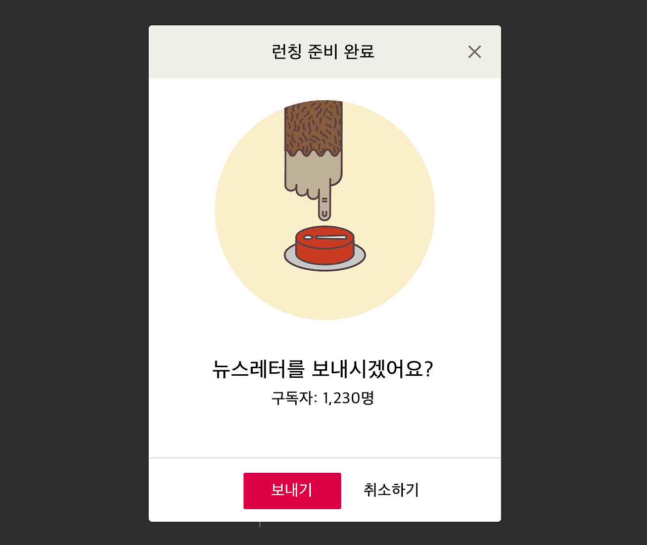 어떤 중요한 결정이 이루어지는 순간에 사용자가 의도치 않게 결정 버튼을 누르게 될 수 있습니다. 아래 예시는 구독자들에게 뉴스레터를 보내는 결정단계에서 확정하는 팝업의 화면인데요. 마치 미사일을 발사하는 것을 연상시키는 이미지를 제공하고, 또 버튼은 빨간색으로 시각적으로 보여주고 있어 확정하기 전에 한번 더 심사 숙고할 수 있게 도와주는 것 같습니다.