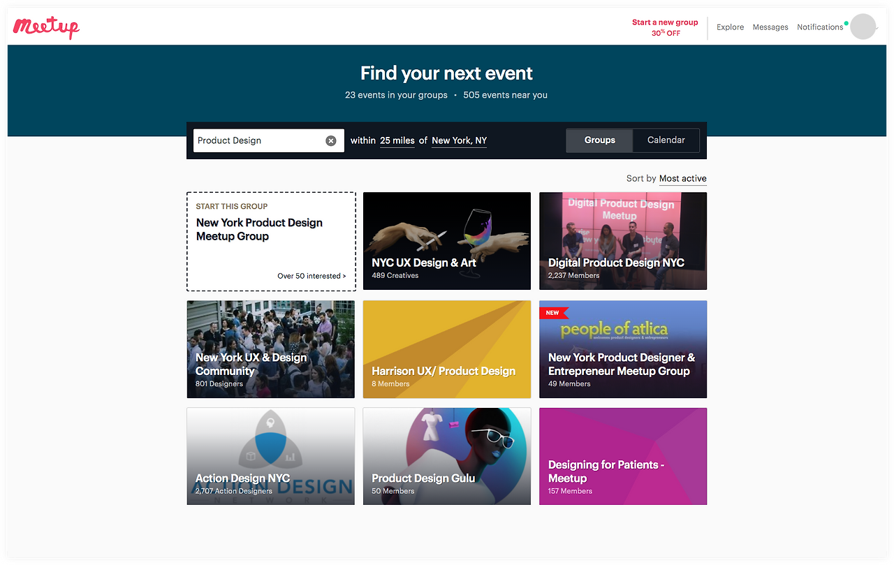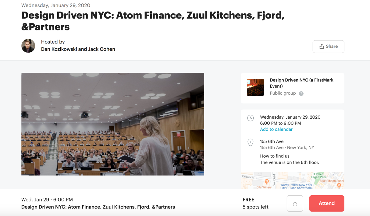 한 가지 팁이라면, 각 밋업마다 활발하게 돌아가는 곳이 있는가 하면 그렇지 않은 경우도 있다. 밋업이 얼마나 활발한 지 알고 싶으면 회원수와 Event가 얼마나 정기적으로 열렸는지 보면 된다. 참고로, 내가 즐겨 갔던 Design Driven NYC 밋업의 경우 회원수가 12,000명이 넘고 2~3달에 한번씩 열린다. 엄청난 회원수라고 볼 수 있고 이벤트도 이 정도면 정기적으로 열린다고 볼 수 있다.