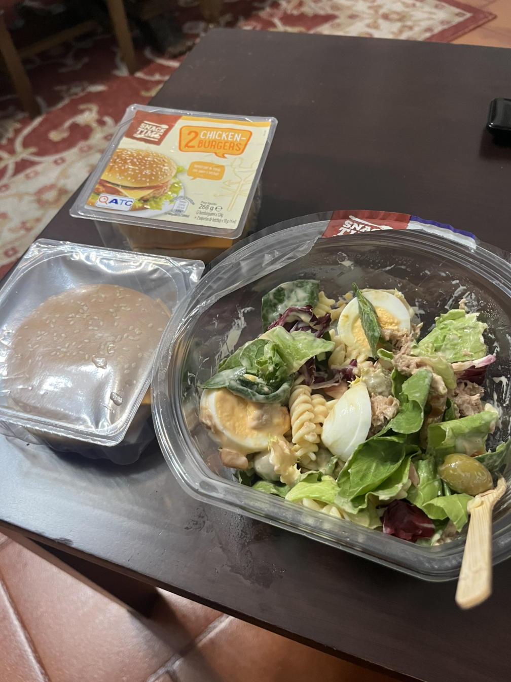 저녁은 오는 길에 있던 마트에 들러서 산 샐러드와 햄버거를 먹었다.