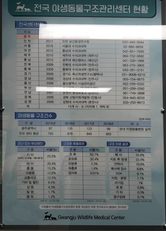 센터 견학 기회가 생겼을 때 야생동물 수의사라는 것을 처음 들어보기도 했고, 어떤 일을 하는지도 가늠이 안 갔다. 흔히 볼 수 있는 것이 로드킬이나 수로에 빠진 동물, 덫에 걸린 동물이어서 고라니 등의 포유류를 상상했는데, 위의 사진에서 보듯 구조된 동물의 비율에서 조류의 비율이 높고, 실제로 센터에도 조류가 정말 많았다.