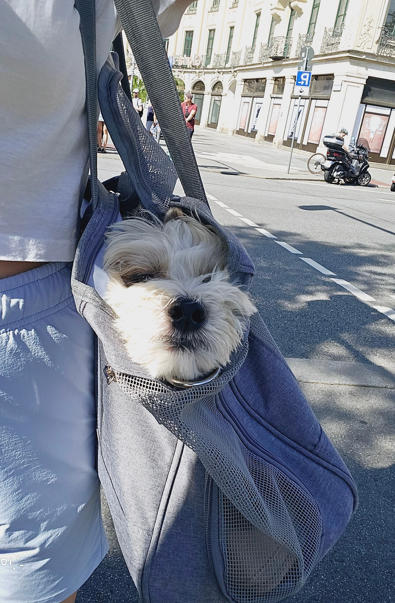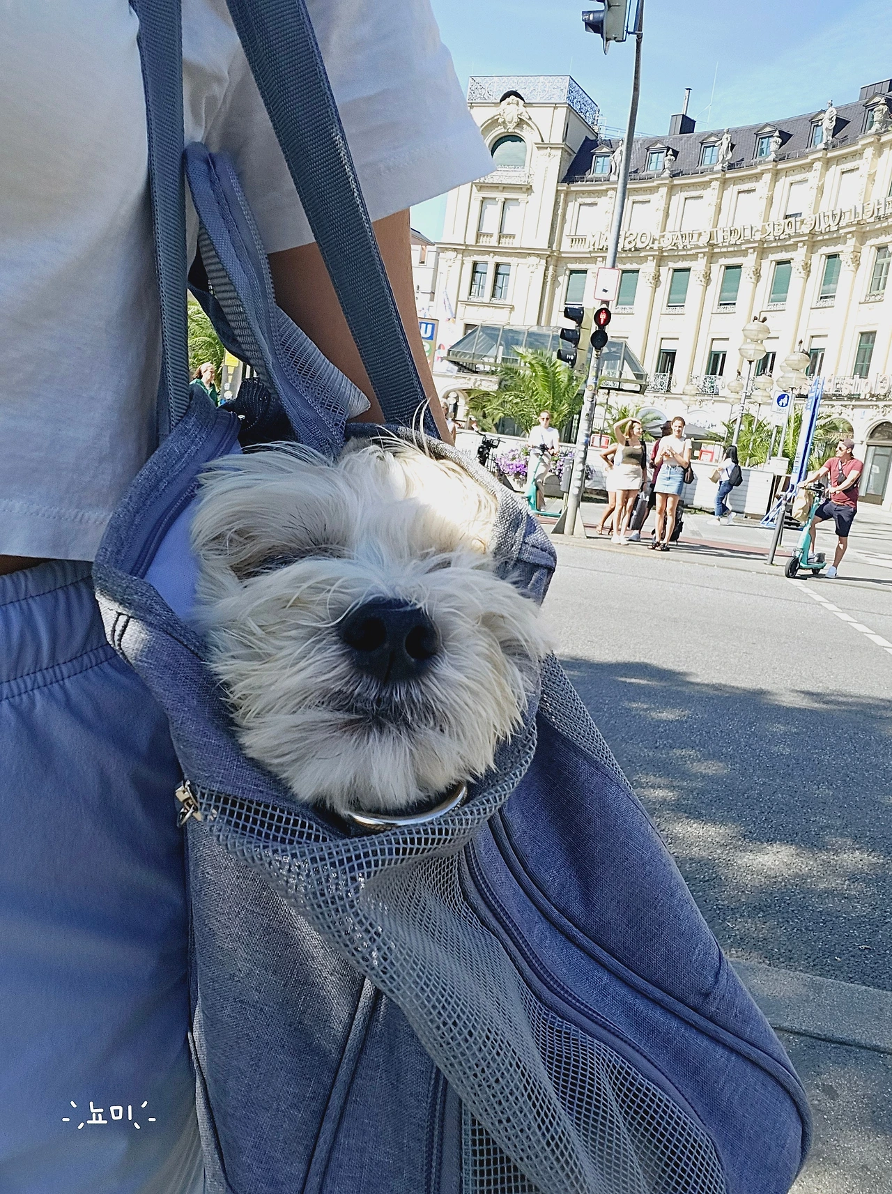 하지만, 사람이 많아 걷기 싫다는 방울 강아지. 이럴 줄 알고 이동 가방을 챙겨왔지.