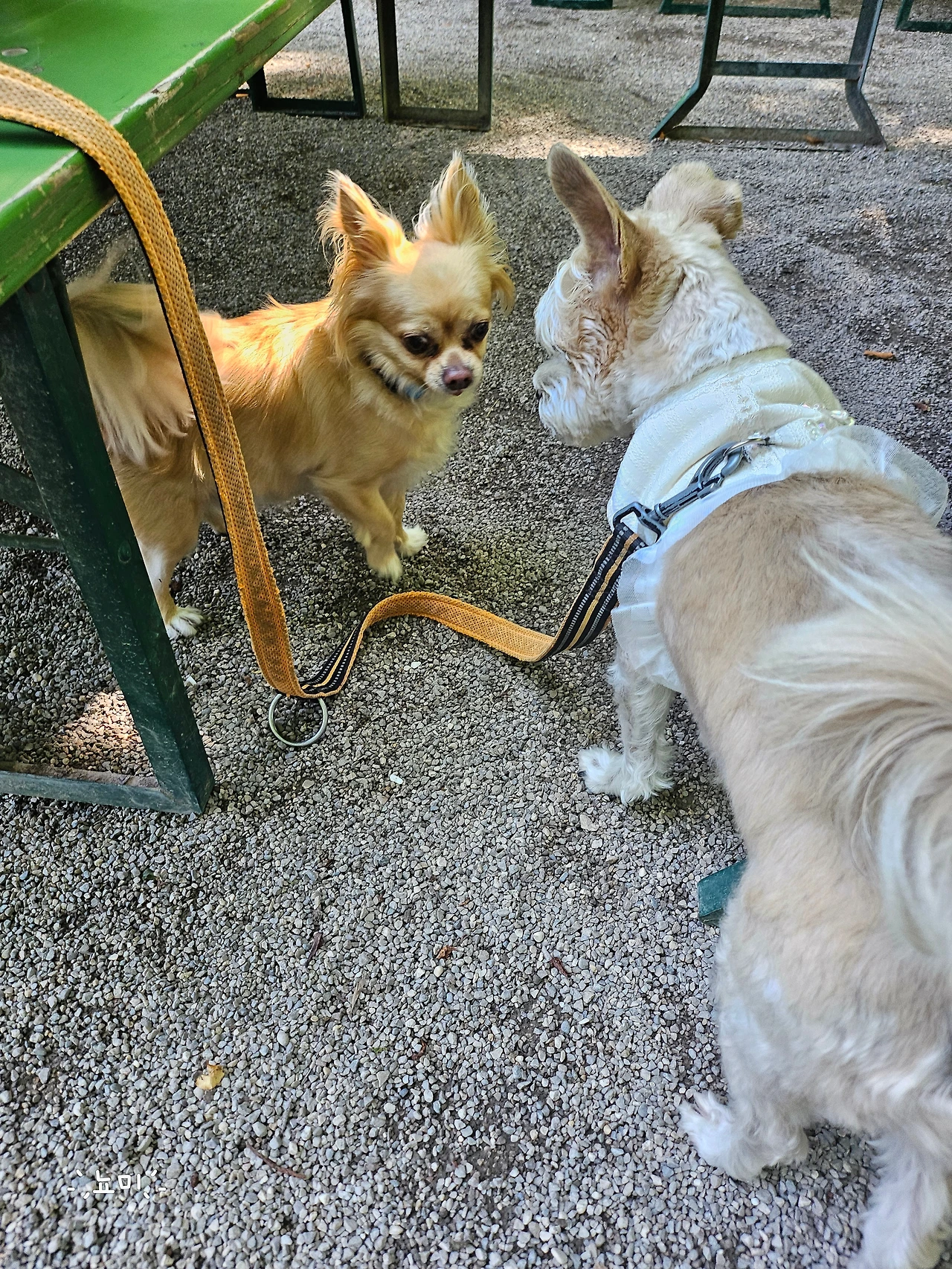 역시나 이 좋은 것들을 자신들의 반려견과 즐기는 독일인들. 방울이와 적극적으로 인사를 하러 온 치와와 아이. 이 강아지 이외에도 여러 테이블에서 반려견과 아침의 여유로운 시간을 즐기고 있는 사람들이 많았다. 여태까지 독일에서 만난 강아지들은 한국에서 그 흔한 몰티즈 한 마리조차 없고, 20kg이 넘는 대형견들 뿐이라 그동안 방울 강아지가 가장 작은 강아지였는데, 오랜만에 방울이랑 비슷한 체격의 강아지를 만나서 방울이도 반가웠는지 서로 냄새를 맡았다.