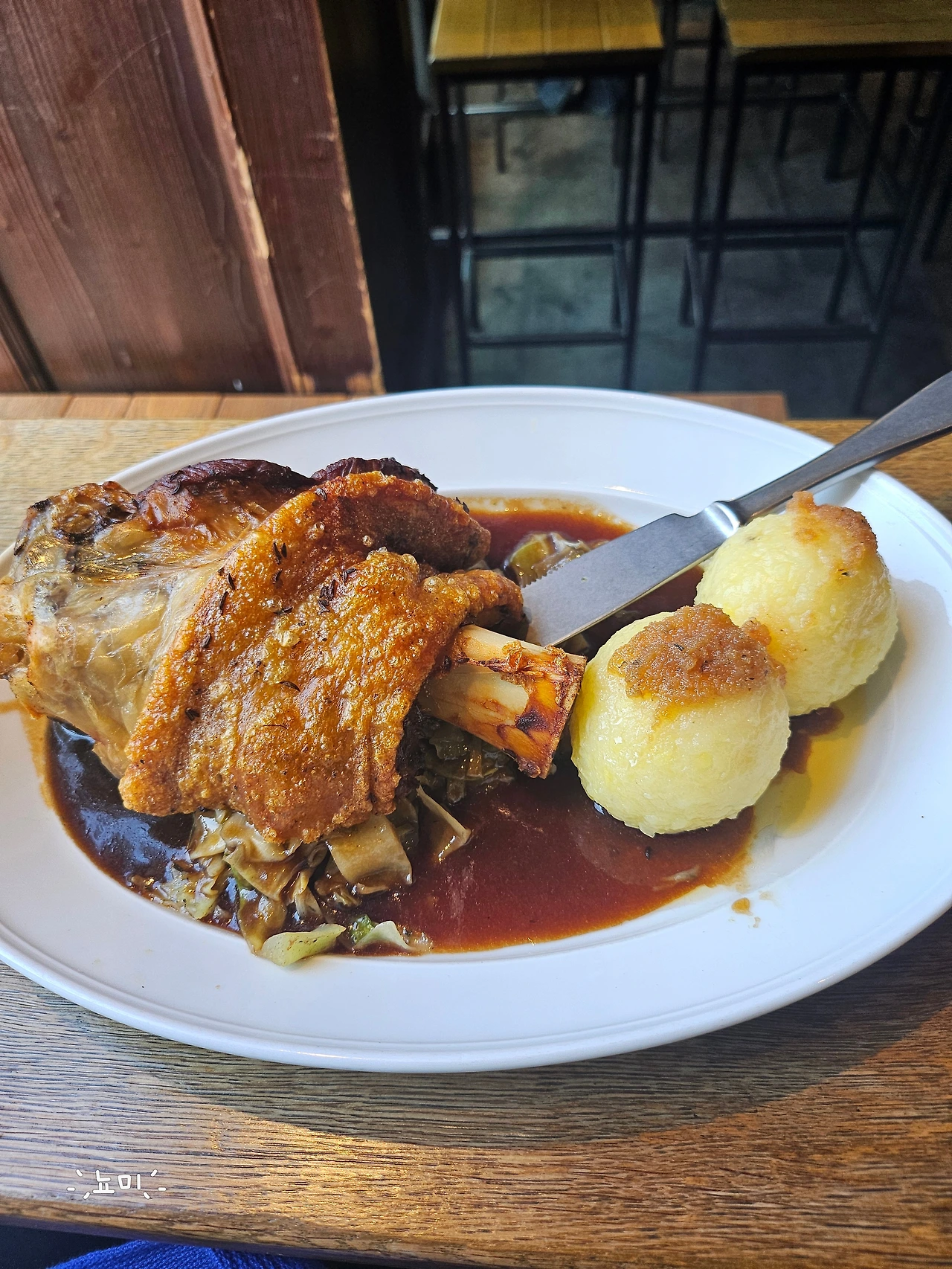 전통식 학센은 엄청 짜다고 하던데, 이곳은 전통을 유지하는지 깜짝 놀랄만큼 짰다. 한국인들이 짜게 먹는 줄 알았는데, 유럽의 음식들에 비하면 한국 음식들은 싱거운 편이다. 학센의 첫 느낌은 엄청 짰고, 겉의 튀긴 면은 매우 딱딱했고, 안의 고기는 부드러운 부분도 있었지만 말라비틀어진 것도 있어서 겉모습은 만화에서 보는 먹음직스러운 고기덩어리의 느낌이지만 맛은 총체적 난국같은 느낌이다. 학센 옆의 두 덩이는 감자인줄 알았는데, 빵이었다. 우리나라 술빵보다 진득한 식감이었고, 소스에 찍어먹어도 학센과 어울리는 느낌은 아니었다. 차라리 곁들여 먹을 채소가 필요했다. 뮌헨 내의 어느 학센 집을 가도 비슷할 것 같아서 학센은 이렇게 먹어본 것으로 만족했다.