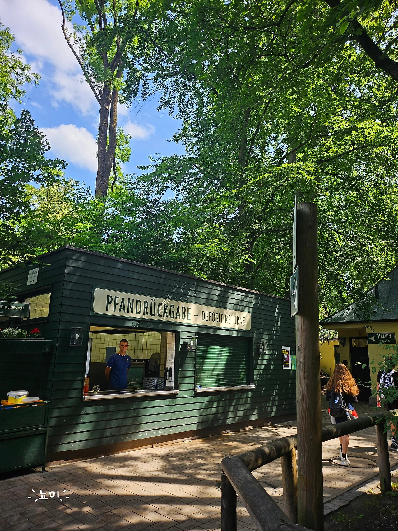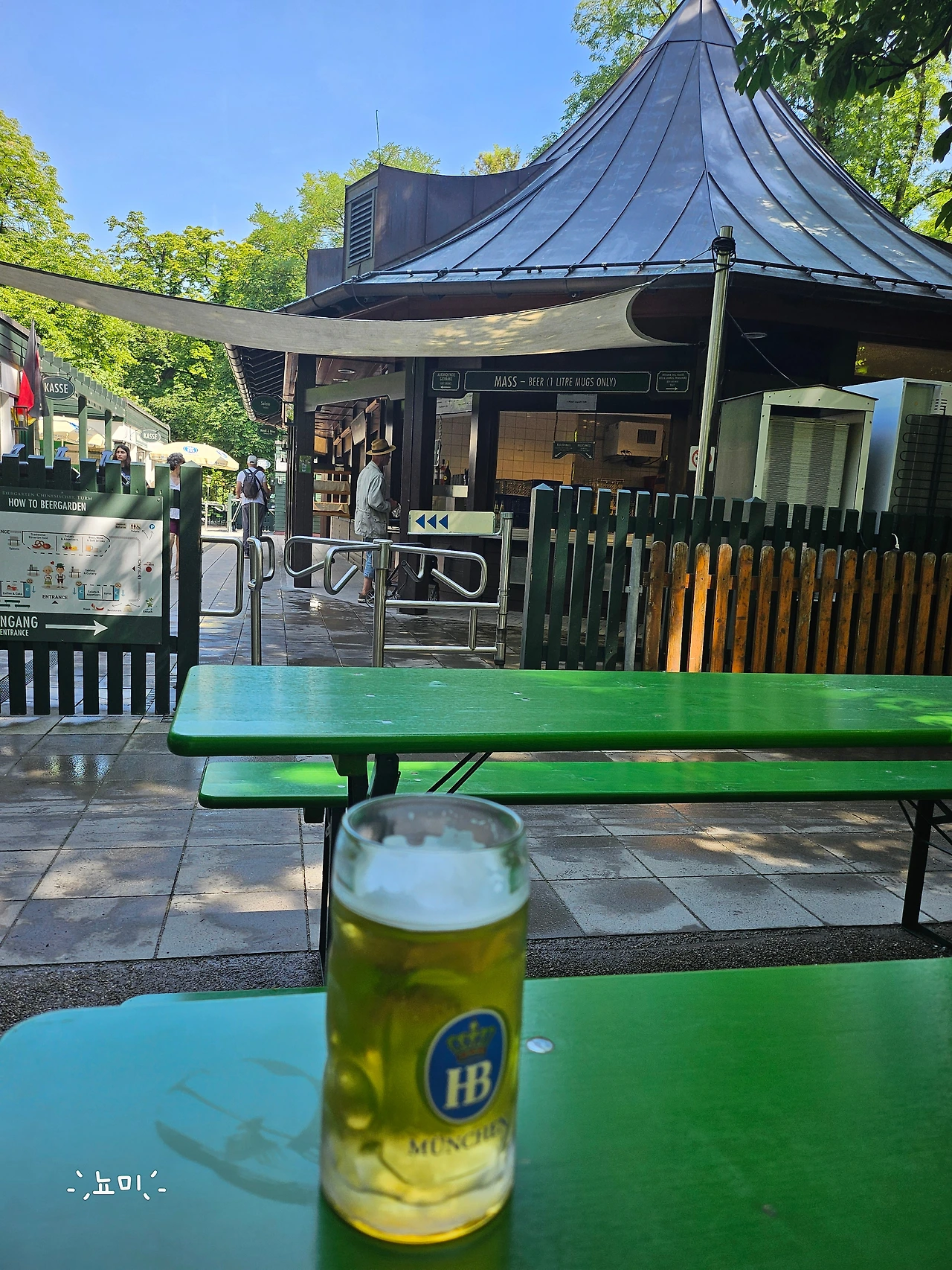 수많은 테이블 뒤편에 작은 매점이 있다. 입구가 여러 곳이라 선택해서 들어가면, 음료를 시키고, 마음에 드는 음식을 주문하면 된다. 음식은 샐러드 종류, 브레첼(프레첼도 바이에른의 음식이었다. 근데 우리가 생각하는 프레첼과 달리 매우 짜다.), 학센 등의 고기류가 있다. 각각의 장소에서 마음에 드는 음식을 시키고, 음료를 받고, 출구에서 한꺼번에 계산하는 방식이다. 현금만 받을 것 처럼 생겼지만, 카드 결제가 아주 잘 된다. 관광지에 위치한 비어가든이라 물가가 비싸기도 하고, 맥주 한 잔만 즐기고 싶어서 라들러 한 잔 시켰다. 잔은 보증금이 있다.