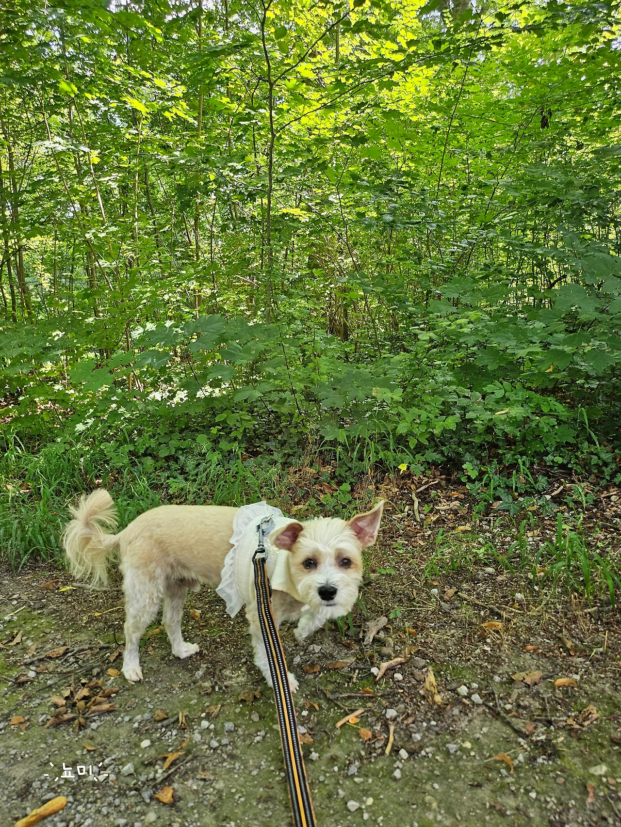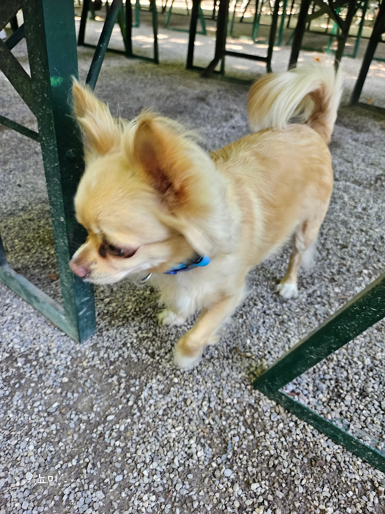 맥주 한 잔 하고, 영국정원 산책을 하는데 꼬리 흔들며 산책 잘 하다가 사진만 찍으려고 하면 꼬리 내려버리는 방울 강아지..