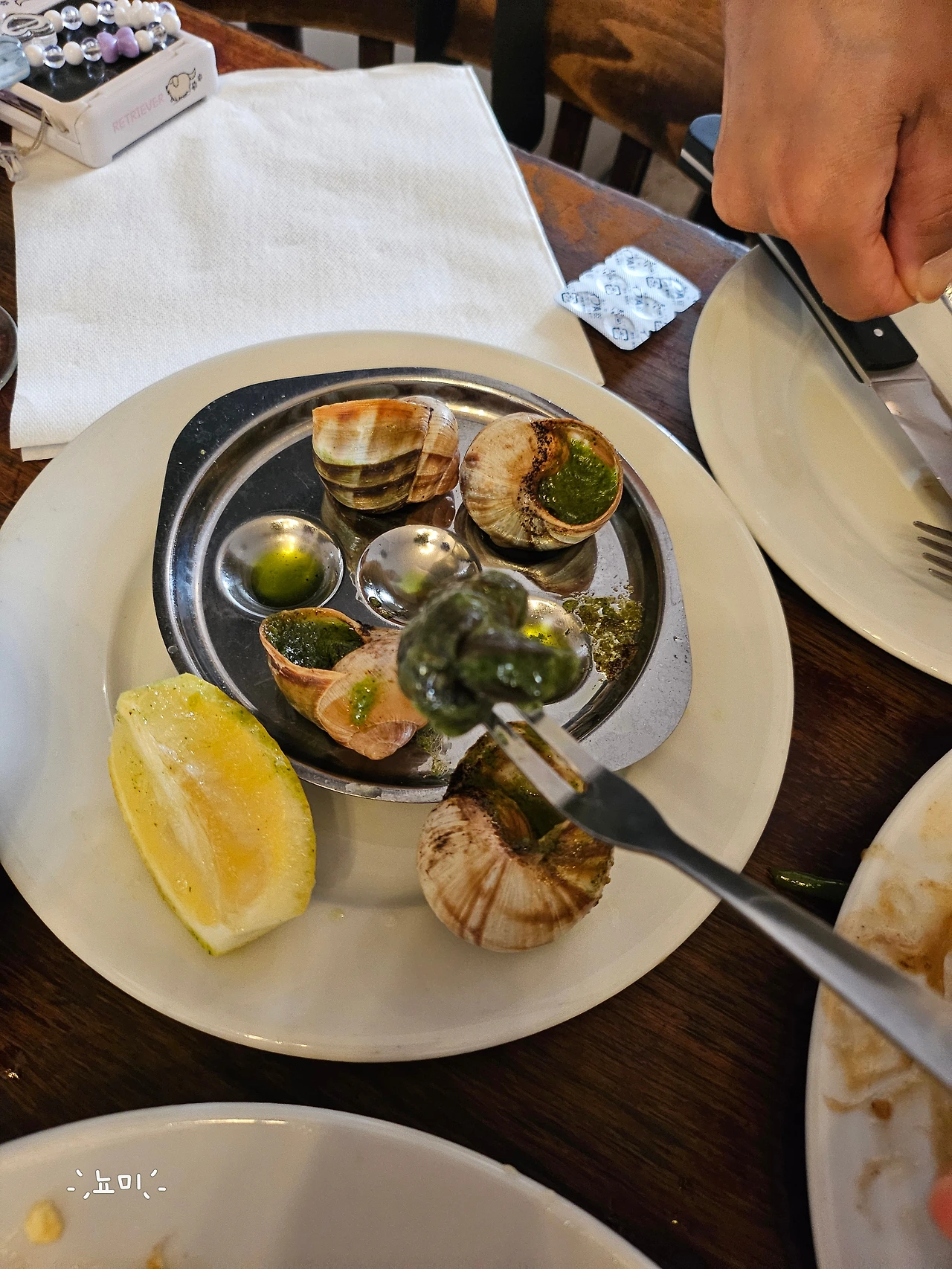 이후 달팽이를 고정시킬 수 있는 동그랗게 홈이 패인 접시에 달팽이가 올려져서 서빙된다. 집게로 동그란 달팽이집을 쥐고, 포크로 살살 돌리면서 달팽이살을 빼낸다. 파슬리, 오일, 후추로 양념이 되어 있고, 약간의 마늘 맛도 난다. 한입에 왕 넣고 씹었는데, 흔한 골뱅이 식감이다. 골뱅이 종류를 먹으면 그 안에 내장이 나오는 느낌이 싫은데, 달팽이는 의외로 그런 부분이 적고 쫄깃한 부분만 있어서 6개라 두 개씩 할당이 되었는데 첫 번째를 먹고나니 다음 에스카르고는 두려움 없이 맛있게 먹었다.