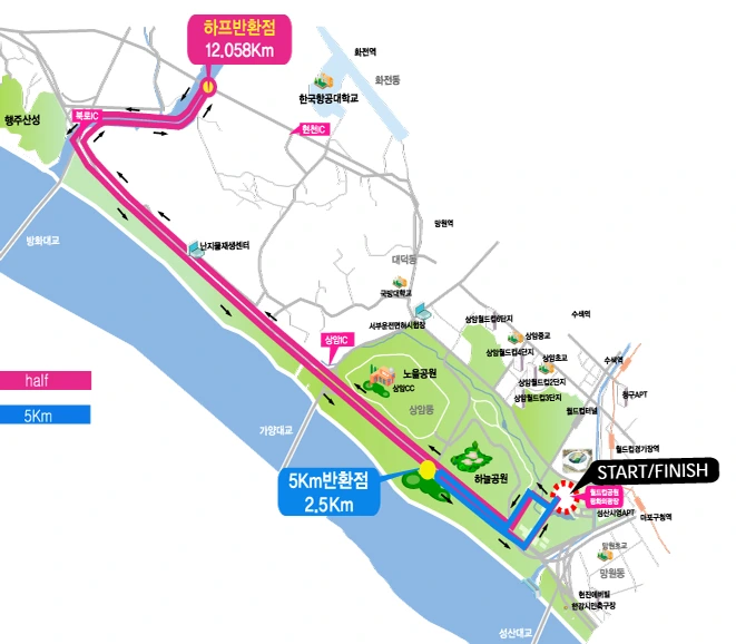 월드컵 공원에서 출발해 한강공원을 따라 달려 방화대교 아래의 반환점을 돌아 출발했던 곳으로 돌아오는 코스다