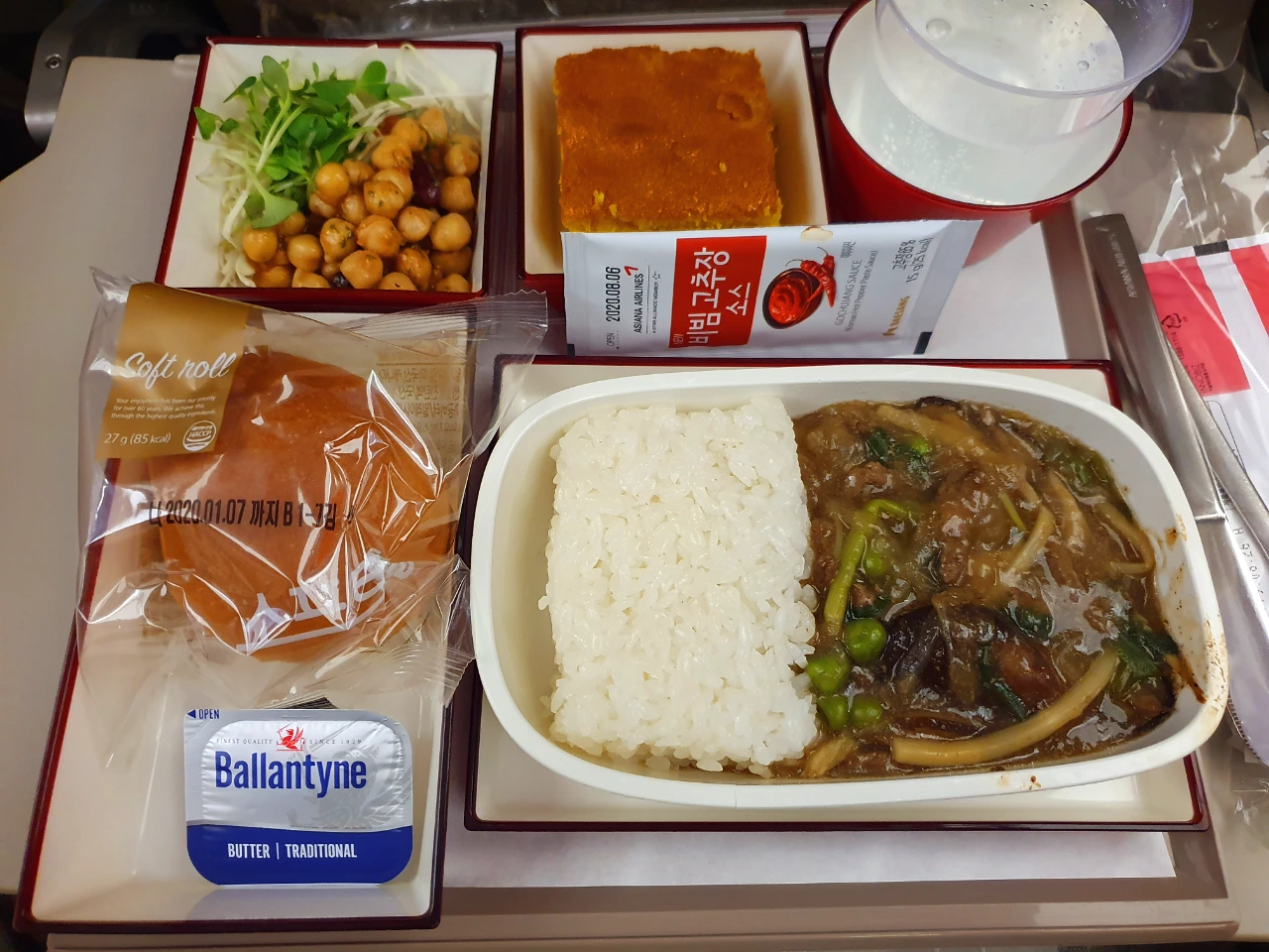 고추장을 곁들인 기내식으로 숙취는 완전히 해소됐고 이 밥은 양이 너무 적었다