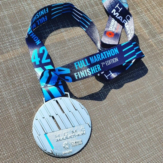 풀 마라톤 완주에 대한 축하 멘트와 함께 메달을 받아 목에 걸었다