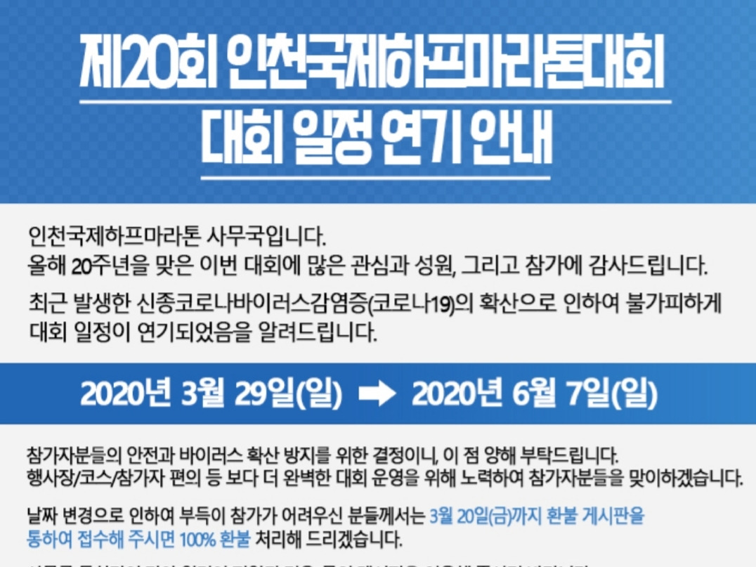 인천 하프도 동마와 마찬가지로 2년간 10km를 뛰었고 올해 첫 하프를 앞두고 있으며 일단 취소되지 않았다는 기대에 이 난리 난 상황이 빨리 종식되기를 열렬히 바랄뿐이다