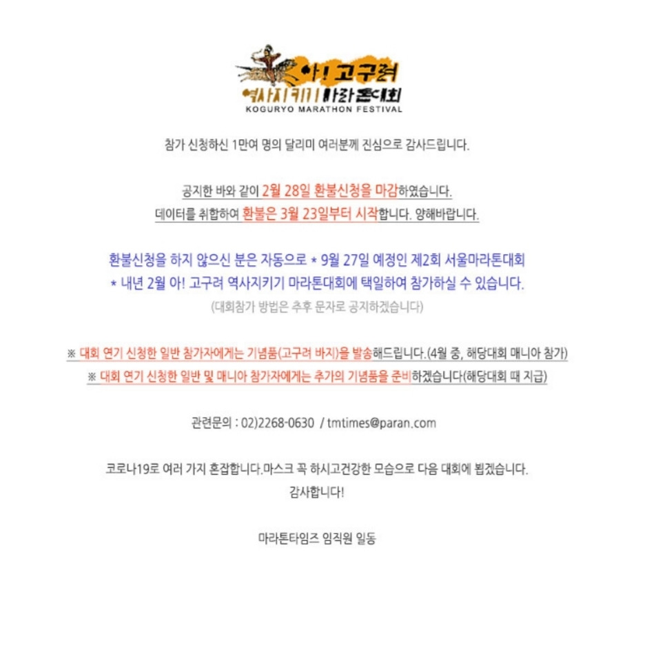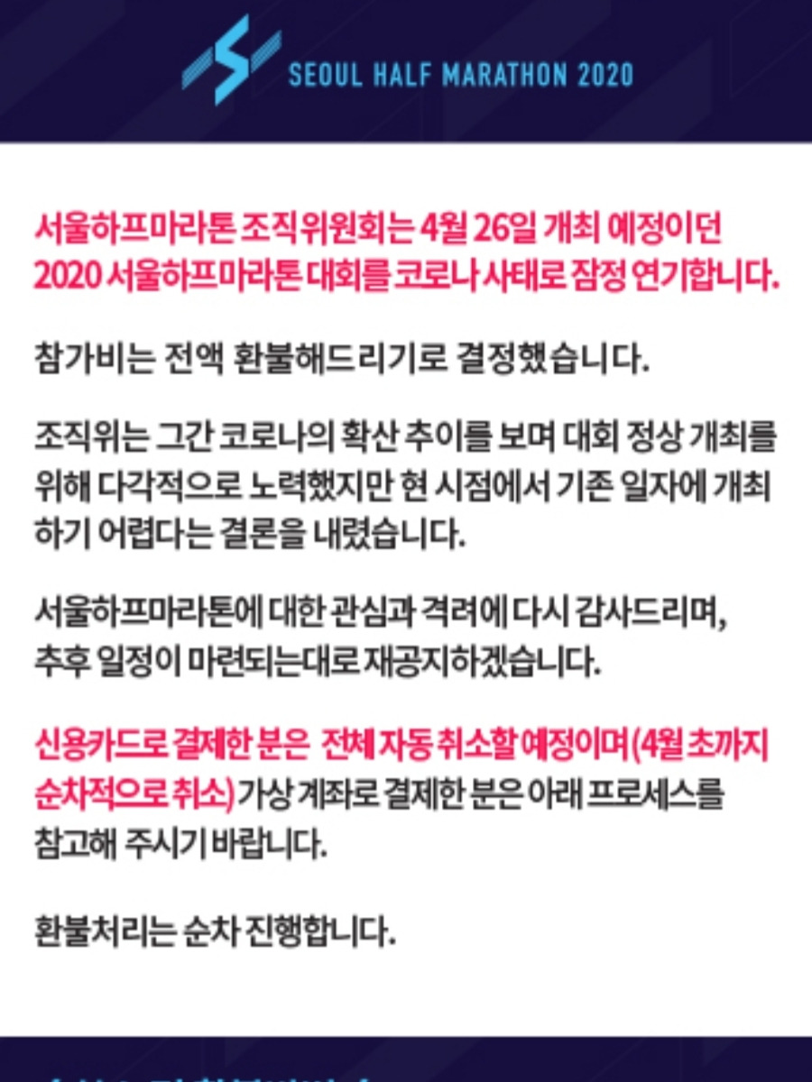 동마에 낙담할 틈도 없이 서울 하프마라톤도 곧이어 취소와 환불 공지를 띄웠으며 이렇게 내가 계획한 봄의 마라톤 대회들은 모두 올해의 문을 닫고 말았다