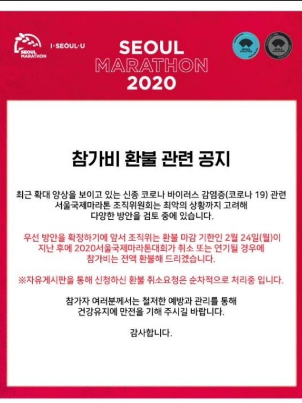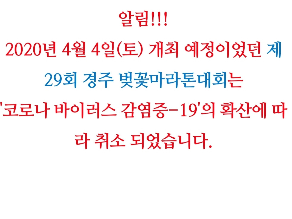 그리고 아직 대회까지는 시간이 꽤 남았지만 이번 바이러스 사태의 직격탄을 맞은 경북의 '경주 벚꽃 마라톤'도 일찌감치 취소되고 말았다
