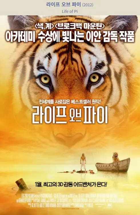 <라이프 오브 파이>는 전부터 봐야 한다고는 생각하고 있었다. 이제야 추천을 받아 본 것이 후회될 정도로 연출, 장대한 영상미, 내용 측면에서 모두 예상을 한참 넘어섰다. 개봉 당시 영화관에서 봤으면 더 좋았을 텐데 아쉽다. 이 영화를 통해 '삶과 종교, 인생의 생명력은 어디에서 오는가?'와 같은 심층적이고 다층적인 이야기와 동시에 우리들이 선호하는 이야기와 이야기하는 방식 자체에 대한 내용까지 포함되어 있다.