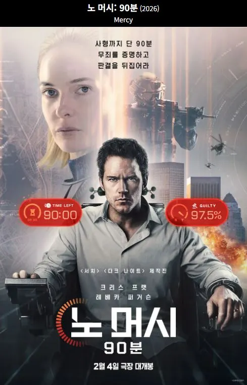 일요일 출근을 하고 난 정신적 대미지를 희석하기 위해 다짜고짜 저녁에 영화관을 갔다. 영화 도착 시간에 맞춰 <노 머시: 90분>을 보게 되었다. 시놉시스나 소재만 봐도 어떠한 내용이 펼쳐질지 예상이 된다고 생각해서 별 기대 없었는데, 생각보다 재밌었다. 영화는 <서치> 제작진이 만들었는데, 서치의 느낌이 많이 났다. 하지만, AI 기술이 뜨거운 감자인 요즘 시대에게 생각할만한 주제와 영리한 연출, 스펙터클한 장면들로 어필하고 있다. <서치>를 보지 않았다면 더욱 재미있게 느껴졌겠지만, 그럼에도 많은 장점을 가진 영화라고 생각한다.