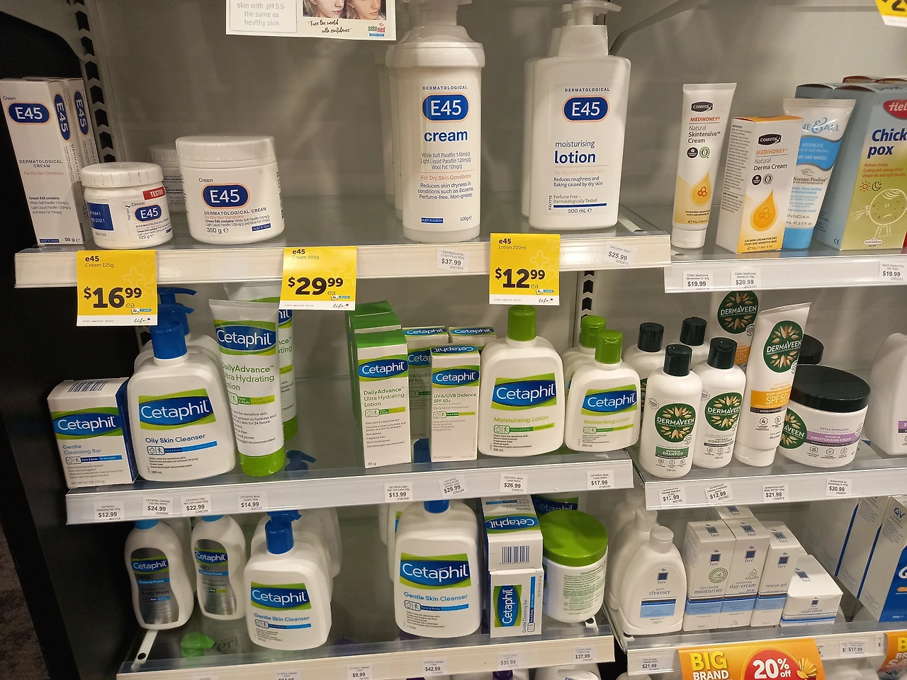 또 우리네처럼 스킨이나 로션 , 영양 크림 등의 기초 화장품의 개념은 거의 없으며 많은 노인들이 샤워할 때 비누 만을사용하고 세안 후에도 아무것도 바르지 않거나 슈퍼마켓 등에서 구입한 저렴한 로션 만을 바르거나 병원에서 공짜로 주는 몸에 바르는 수분 크림을 얼굴부터 온 몸에 바른다. 물론 뉴질랜드에서 만드는 화장품도 있고 일반 약국의 화장품 코너에서는유명 브랜드 화장품도 팔지만 가격이 비싼 편이어서 대중적이지는 않고 주로 호주나 미국 등에서 나온 nz$7-20 정도의 저렴한 로션 등을 구입하는 편이다.