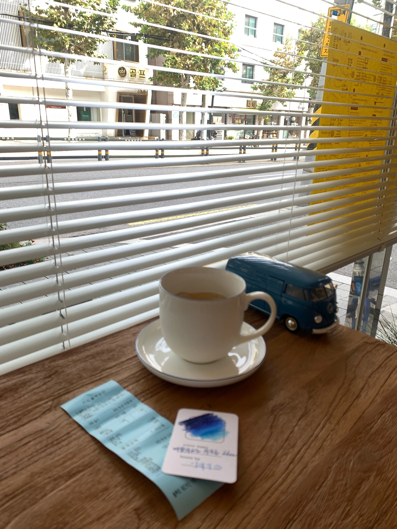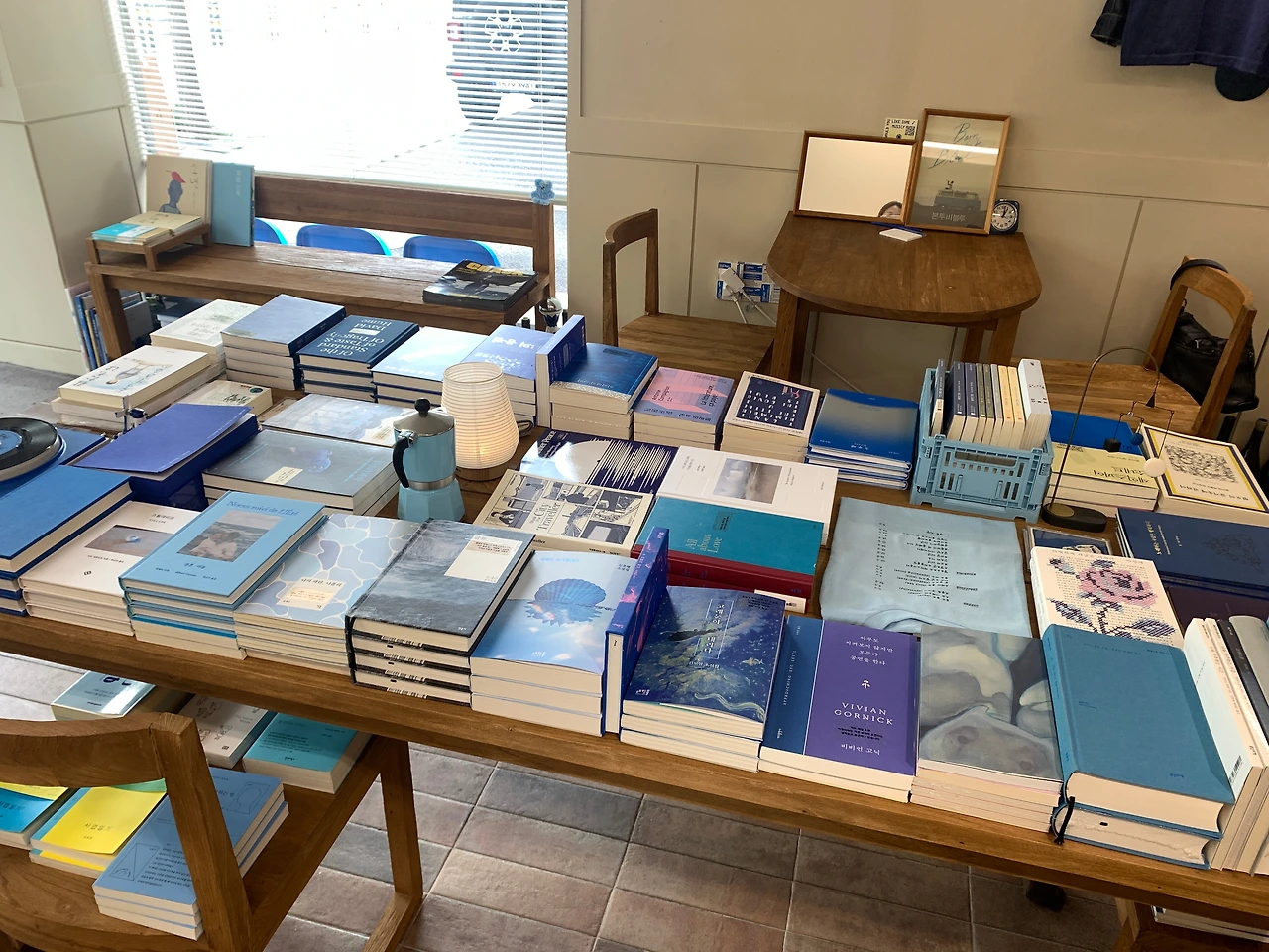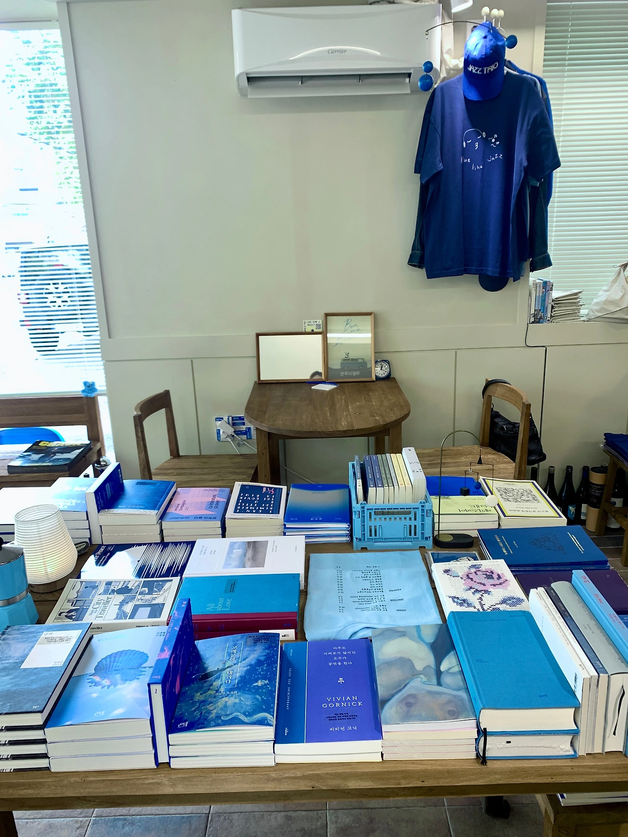 사장님은 '블루'라는 색을 테마로 낮과 밤 관계없이 커피와 술을 팔고 책을 파는 곳이라고 했다. 멋있는 공간이구나. 어떤 한 사람의 취향이 켜켜이 녹아있는 공간을 탐색한다는 건 실례가 되리만큼 은밀하고도 신나고 설레는 일이라서 나는 최대한 오랜 시간동안 그 공간 자체를 하나하나 꼼꼼하게 보고 싶었으나 약속 장소로 가던 중 우연히 들른 거라 시간적 여유가 없었다. 언젠가 다시 방문해야지, 생각하면서 아쉬운 마음으로 가게를 나섰다.
