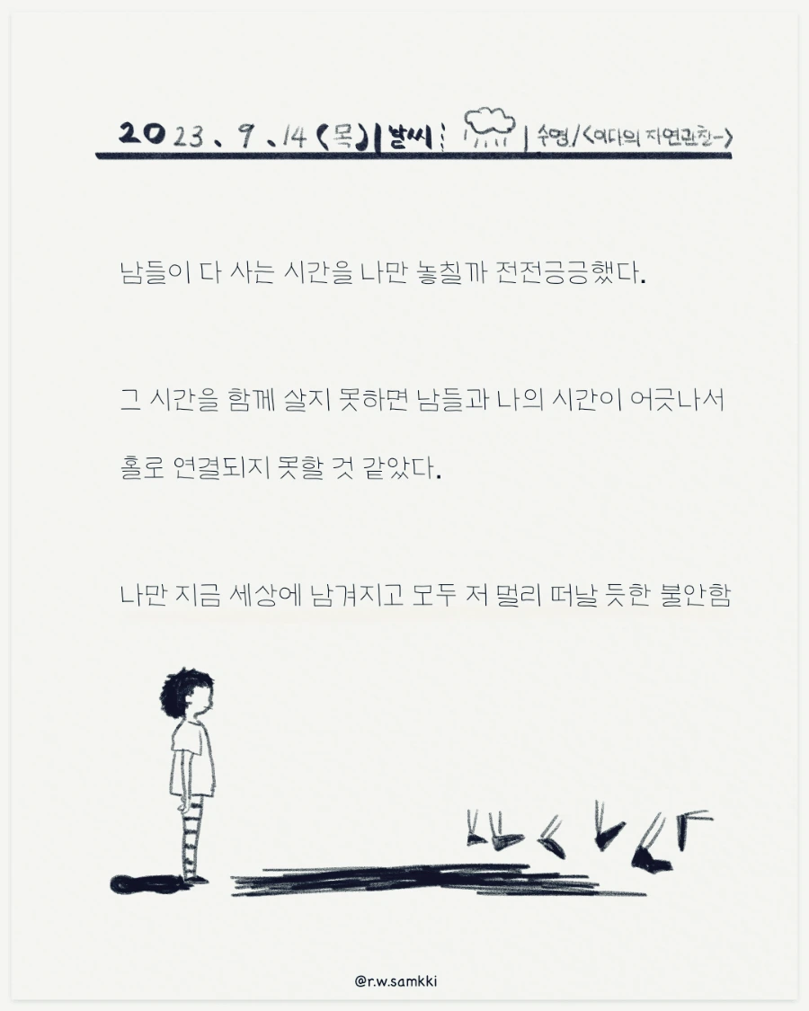 느렸기에 남들이 다 사는 시간을 나만 놓칠까 늘 전전긍긍했다. 그 시간을 함께 살지 못하면 남들과 나의 시간이 어긋나서 결국 홀로 연결되지 못할 것 같았다. 나만 지금 세상에 남겨지고 모두 저 멀리 떠날 듯한 불안함은 두려움으로 이어졌다.