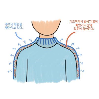 히트텍과 기온, 입는 방식|히트텍의 발열 효과가 좋아도 천이 만들어내는 열보다 외부 공기에 빼앗기는 열이 더 많으면 아무 소용이 없다. 히트텍의 열을 최대한 가둘 수 있게 그 위에 다른 옷을 덧입어야 한다. 이것이 히트텍을 내복으로 입으면 좋은 또 다른 이유다.