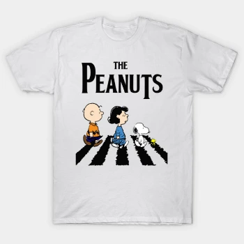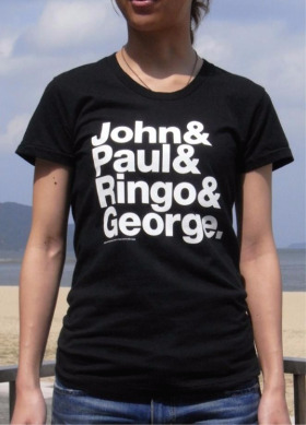 팀명인 'THE BEATLES'는 다양한 서체로 쓰여 티셔츠 위에 인쇄되었는데 유달리 'T'의 세로획이 긴 디자인이 가장 유명하다. 일반적으로 영어 표기의 바닥 기준선인 베이스 라인보다 아래로 표기되는 알파벳은 소문자 'g', 'j', 'p', 'q', 'y'이다. 이런 관습과 다르게 'THE BEATLES'로고는 대문자'T'를 베이스 라인 아래까지 연장시켜 락이 가지고 있는 반항심을 잘 표현했다. 이 서체로 쓰인 비틀즈 티셔츠를 패러디해서 판매되는 티셔츠들이 많은데 아래 그림의 'THE PEANUTS' 레터링 티셔츠도 그 중 하나이다.