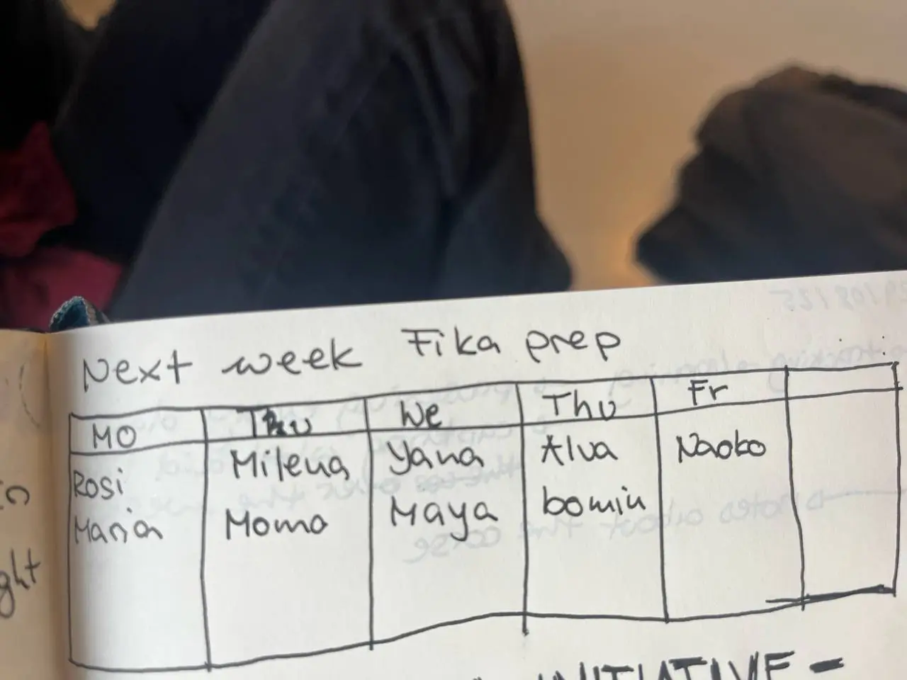 우리는 checkin 시간에 fika time을 위한 조를 정리했다. 나는 alva와 함께 목요일 fika를 준비하게 된다.