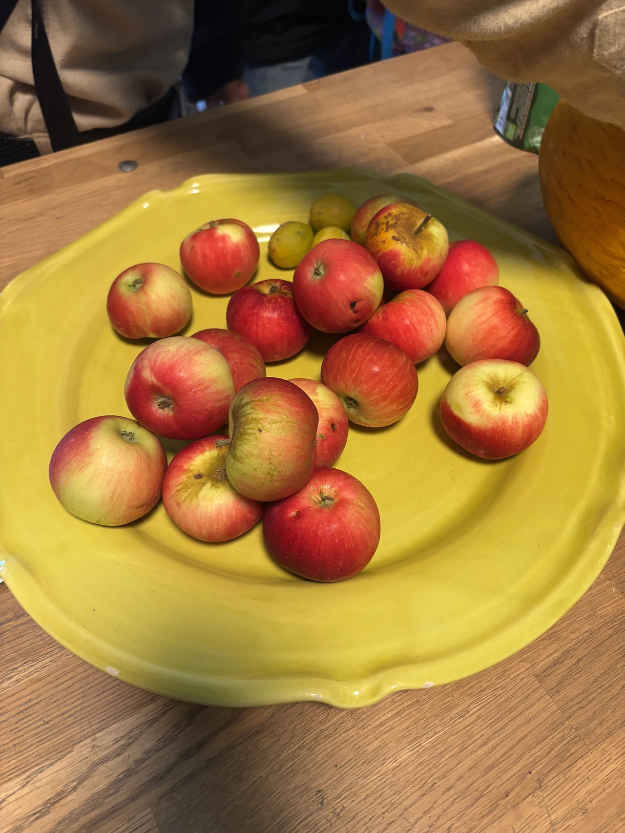 부엌에 우리를 위한 차, 사과, 과일이 놓여 있다.