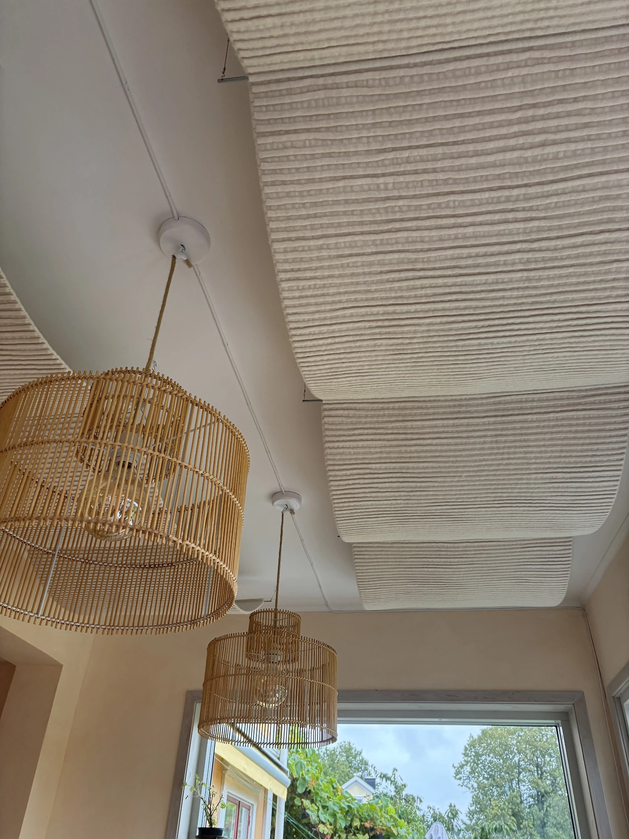천과 나무 조명이 천장을 장식하고 있다.