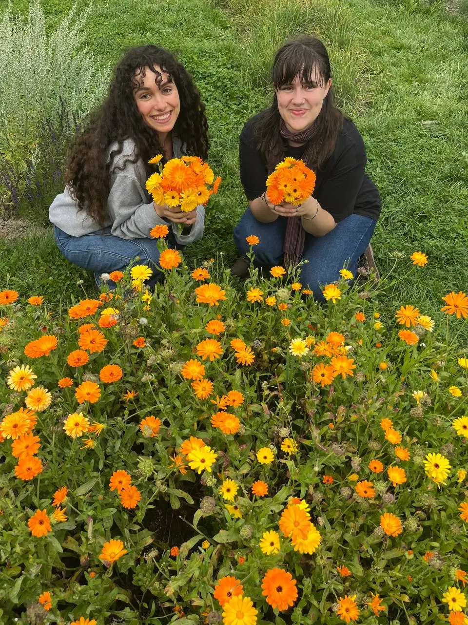 harrison, rosie, lilly가 꽃을 모으고 있다.
