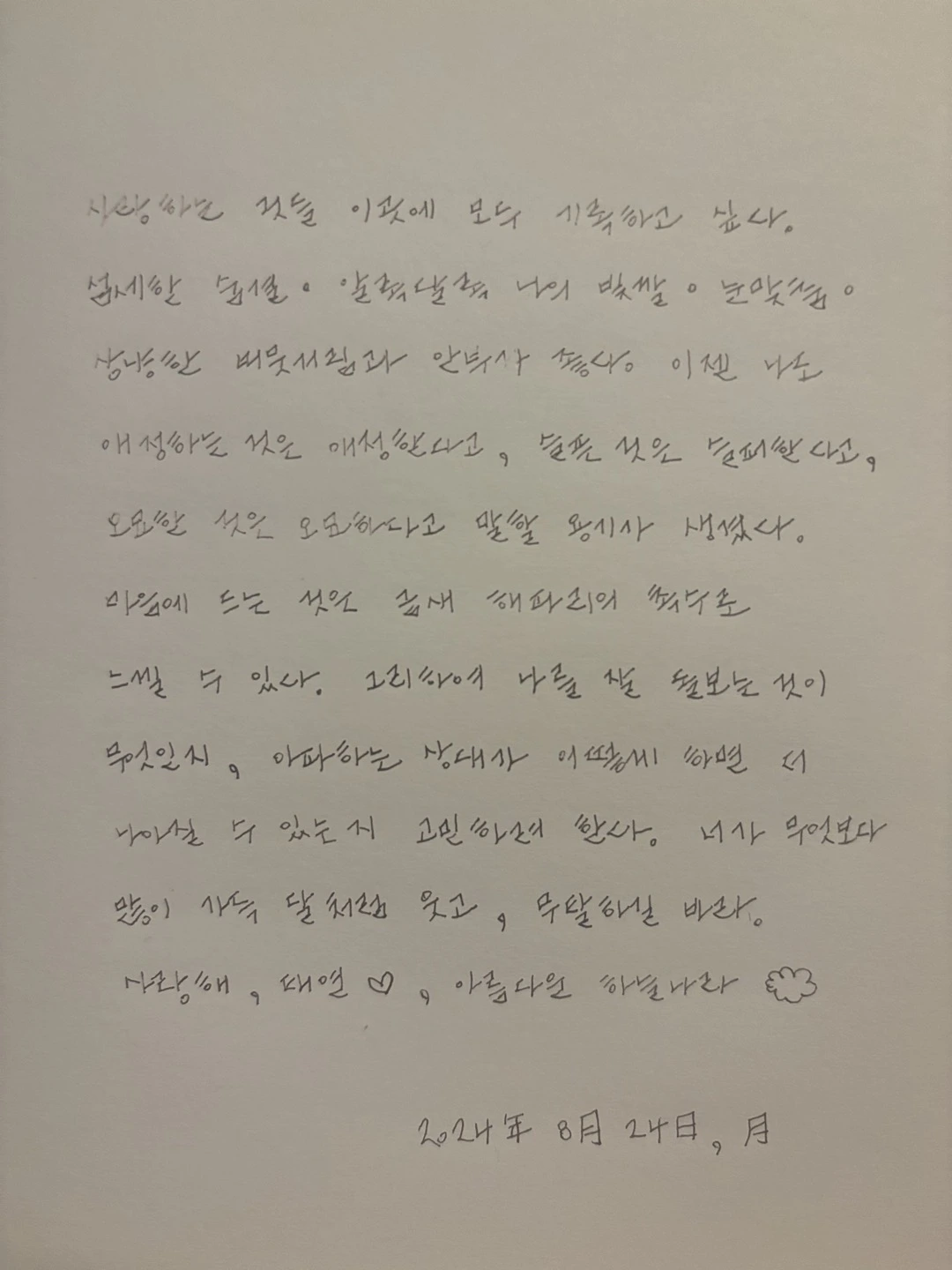 사랑하는 것들 이곳에 모두 기록하고 싶다. 섬세한 숨결, 알록달록 나의 빛깔, 눈맞춤, 상냥한 머뭇거림과 안부가 좋다. 이젠 나도 애정하는 것은 애정한다고, 슬퍼하는 것은 슬퍼한다고, 오묘한 것은 오묘하다고 말할 용기가 생겼다. 마음에 드는 것은 해파리의 촉수로 느낄 수 있다. 그리하여 나를 잘 돌보는 것이 무엇인지, 아파하는 상대가 어떻게 하면 더 나아질 수 있는지 고민하려 한다. 너가 무엇보다 많이 가득 달처럼 웃고, 무탈하길 바라. 사랑해, 태연, 아름다운 하늘나라 ♥